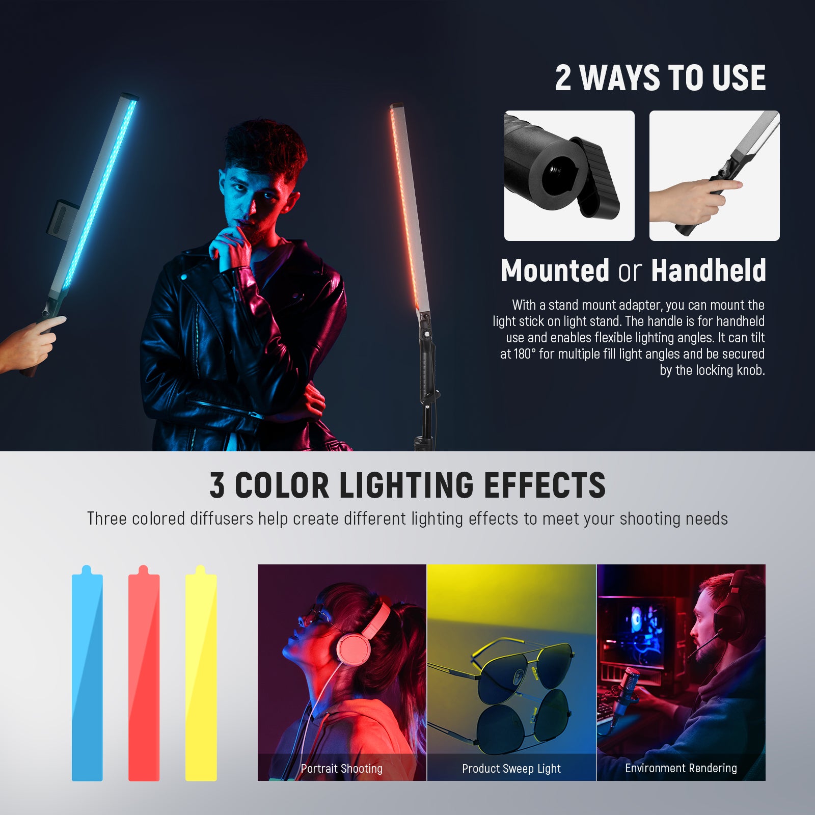 - Kit stick luminoso bicolore aggiornato : progettato per fotografi e fotografia in studio. I filtri colorati in rosso, giallo e blu modificano i colori della luce e forniscono effetti creativi. Ogni stick luminoso offre una temperatura di colore di 3200K~5600K, un intervallo di regolazione dello 0~100%, un CRI elevato di 97+, una potenza di 21W, 105 LED caldi e 105 LED freddi. Ideale per la registrazione di video YouTube, vlogging, giochi, live streaming, ritratti e fotografie di prodotti
