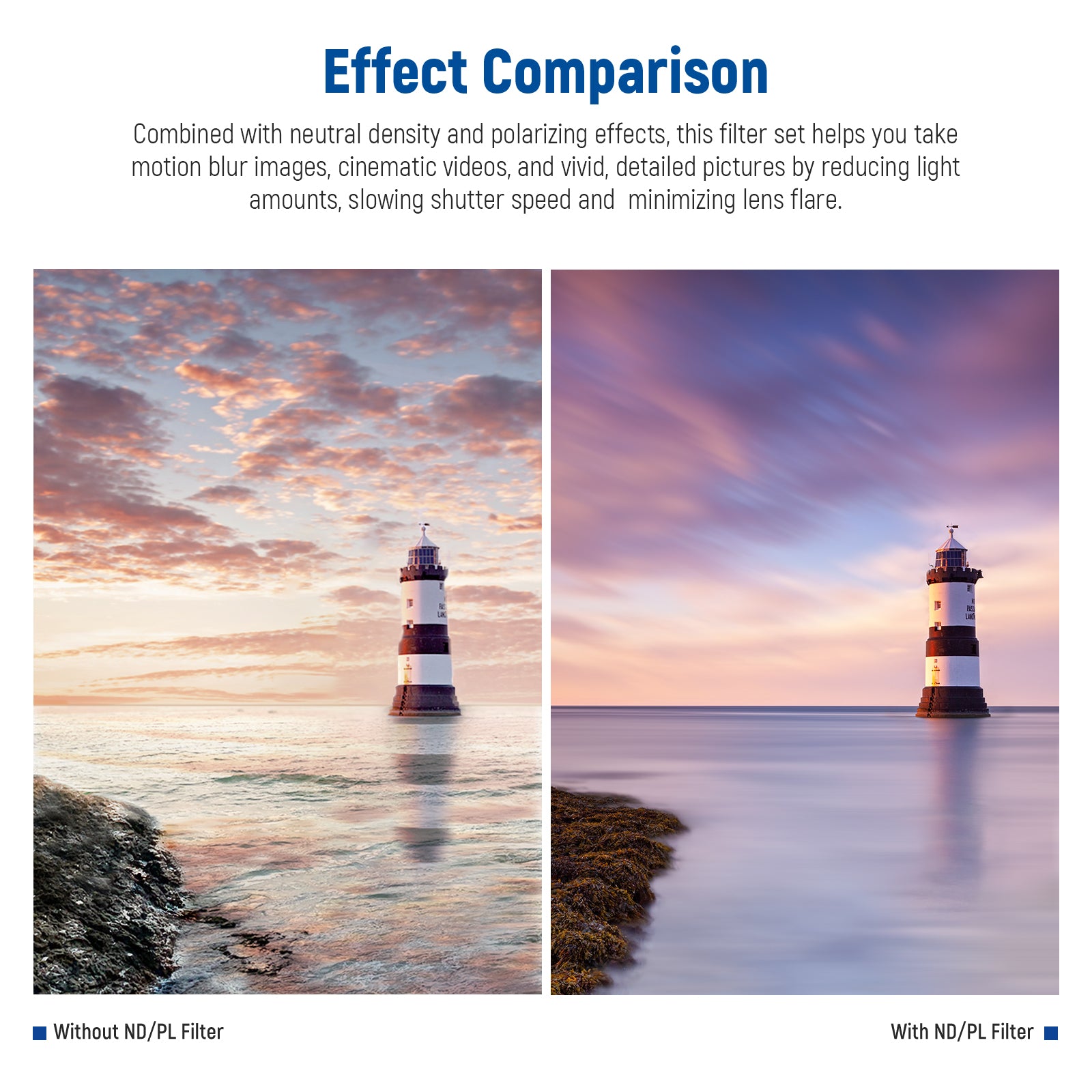 - I filtri ND8/PL, ND16/PL, ND32/PL e ND64/PL riducono la luce senza alterare il colore e consentono aperture più ampie e tempi di esposizione più lunghi.