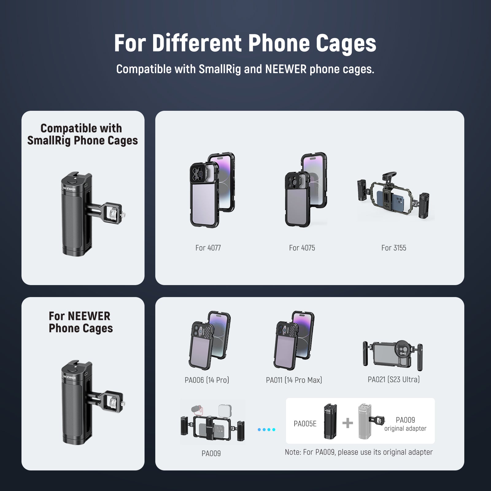 - Due adattatori di montaggio mirati - Include 2 adattatori per adattarsi a vari supporti per smartphone. L'adattatore con una vite da 1/4" e perni di posizionamento è compatibile con SmallRig 4077 (14 Pro Max), Small Rig 4075 (14 Pro) e accessori universali 3155 CPU2391B CPU2494. L'adattatore con una vite da 1/4" e bordi smussati anti-torsione si adatta ai supporti NEEWER, come PA006 (14 Pro), PA011 (14 Pro Max), PA016 (Galaxy S22 Ultra), PA021 (Galaxy S23 Ultra) e supporti per iPhone 16 Pro Max Plus. Per PA009, utilizzare l'adattatore originale