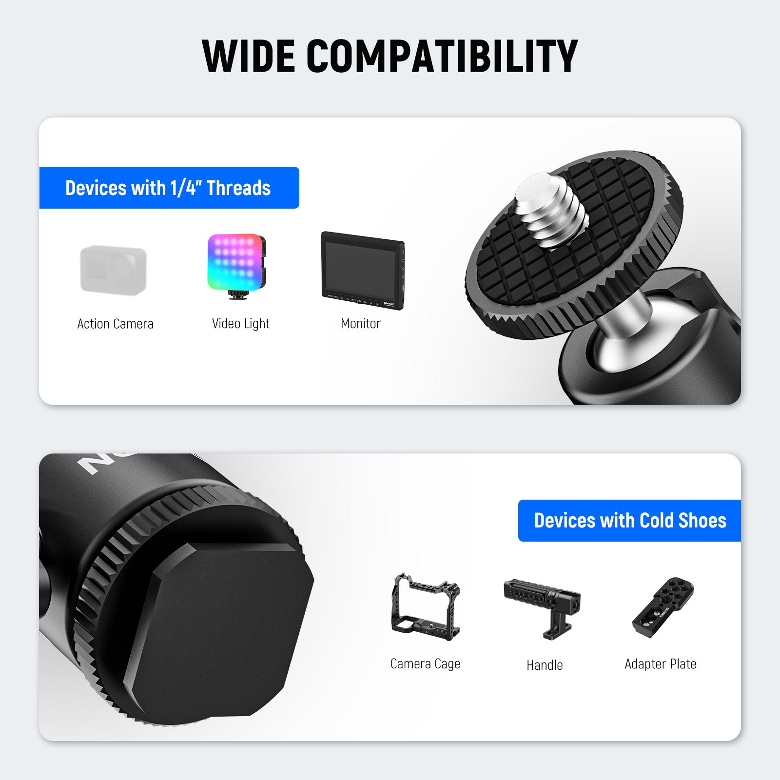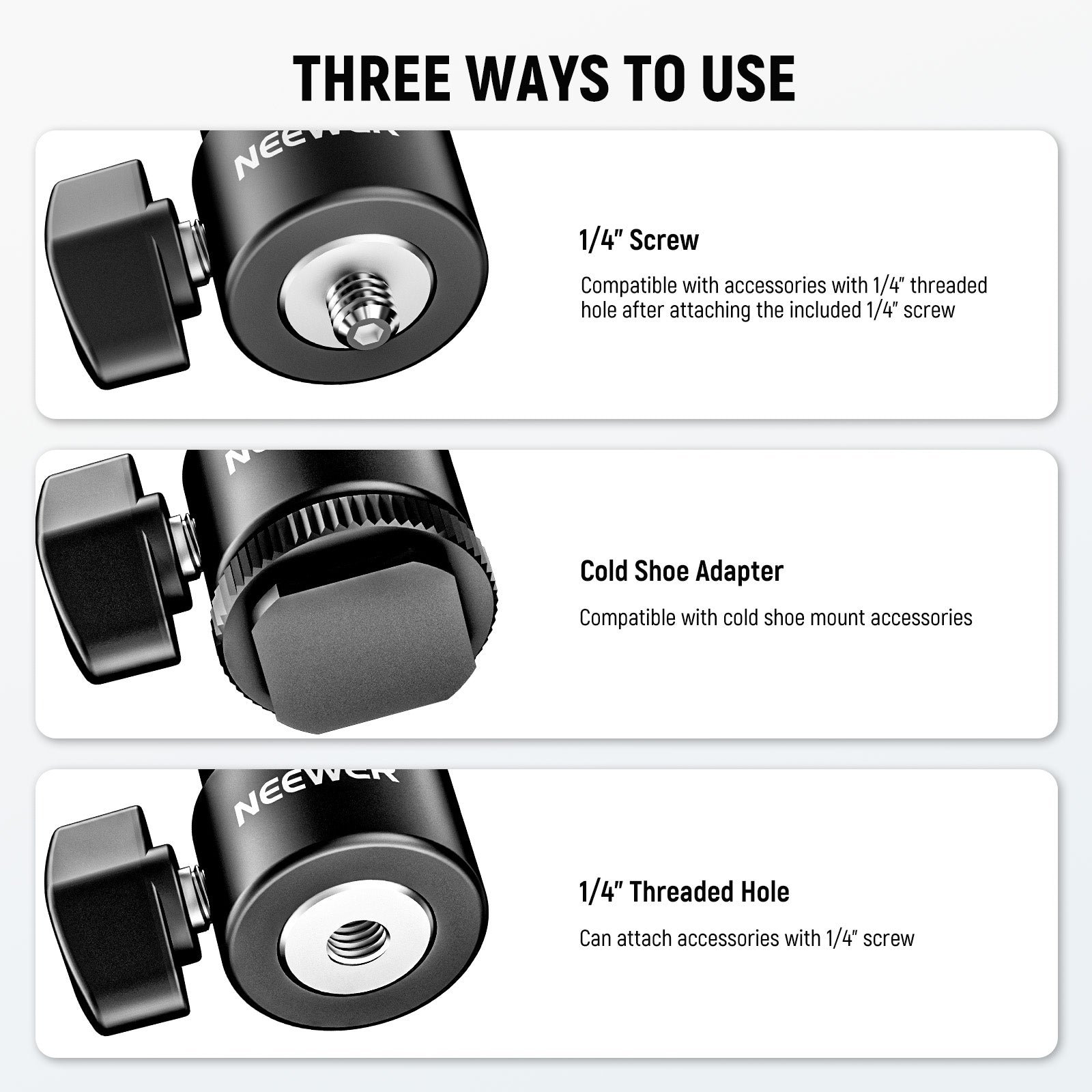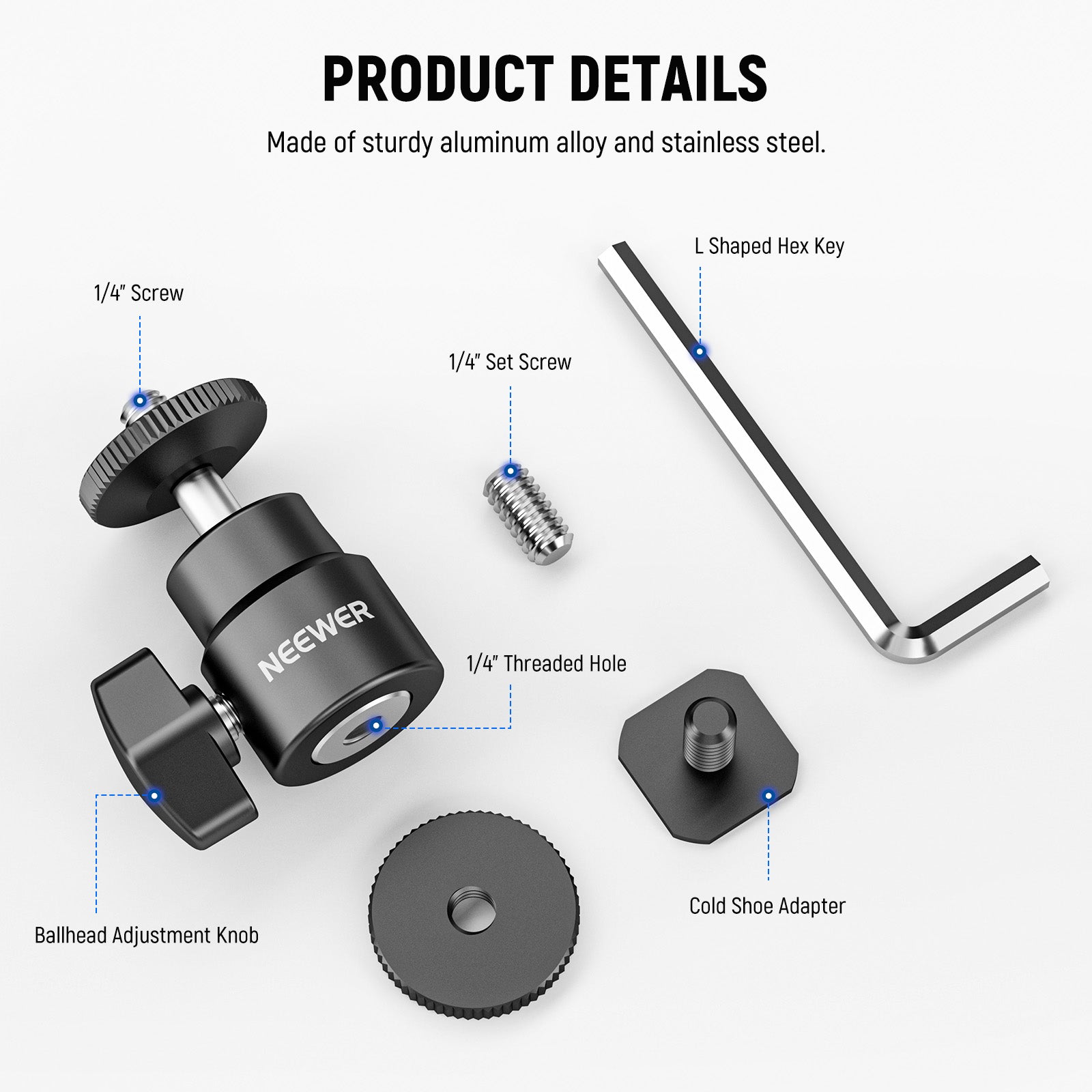 - Mini testa a sfera. Monta in modo sicuro la tua fotocamera tramite l'adattatore per slitta fredda inferiore. La vite superiore da 1/4" consente di montare un'ampia gamma di dispositivi, come luce di riempimento a LED, flash LED, monitor da campo e altri accessori con un foro filettato da 1/4".