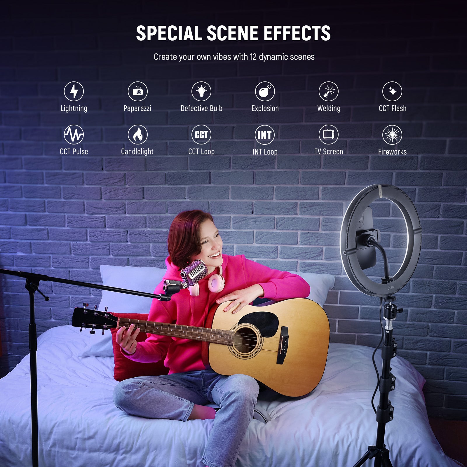 - Modalità effetti scena CCT e FX - La modalità CCT offre un'illuminazione calda e fredda da 2900K a 7000K insieme a un oscuramento da 0 a 100%. L'illuminazione regolabile in modo flessibile può valorizzare tutti i toni della pelle, illuminare il viso e ridurre al minimo le imperfezioni. La modalità FX offre 12 effetti scena realistici per riprese video professionali. Utilizza il controller cablato per ottenere rapidamente l'effetto desiderato