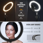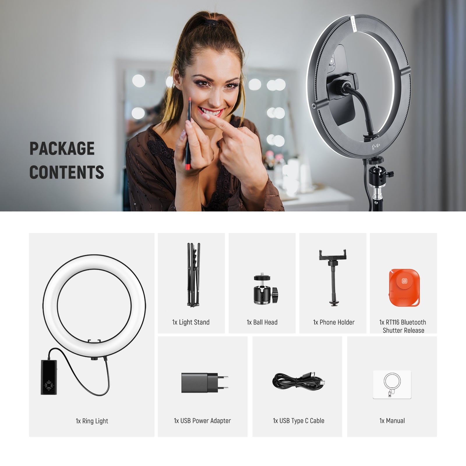 - Luce ad anello bicolore potente da 20 W : una potente luce ad anello circolare da 20 W come luce principale o di riempimento per trucco, estetista, extension per ciglia, tatuaggi, illuminazione per registrazioni video, streaming live, chiamate Zoom al computer, servizi fotografici, selfie e per filmare vlog sui social media TikTok. 168 LED (84 bianco freddo e 84 bianco caldo), oscuramento 0-100%, illuminamento 1660LX/0,5 m e CRI 97+/TLCI 98+ producono una sorgente luminosa brillante o morbida, diffusa e uniforme con una precisione del colore impeccabile.
