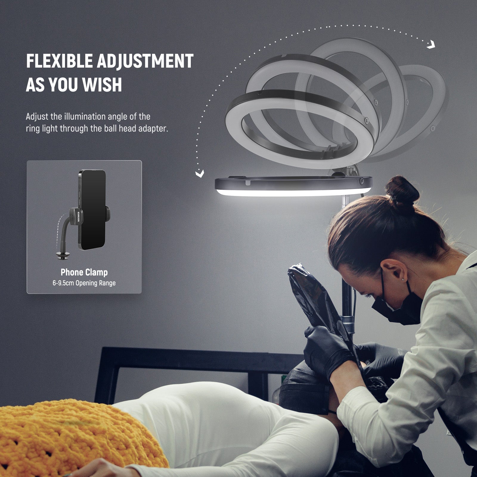 - Testa a sfera a 360° e supporto per slitta a freddo : il kit include una testa a sfera a 360° con una vite da 1/4" per un facile fissaggio della luce ad anello al supporto per luce, consentendo una rotazione di 360° e un'inclinazione di 90° per fornire regolazioni angolari flessibili. Nel frattempo, il supporto per slitta a freddo fissa il supporto flessibile per telefono, mantenendo il tuo smartphone in posizione per una fotografia mobile versatile