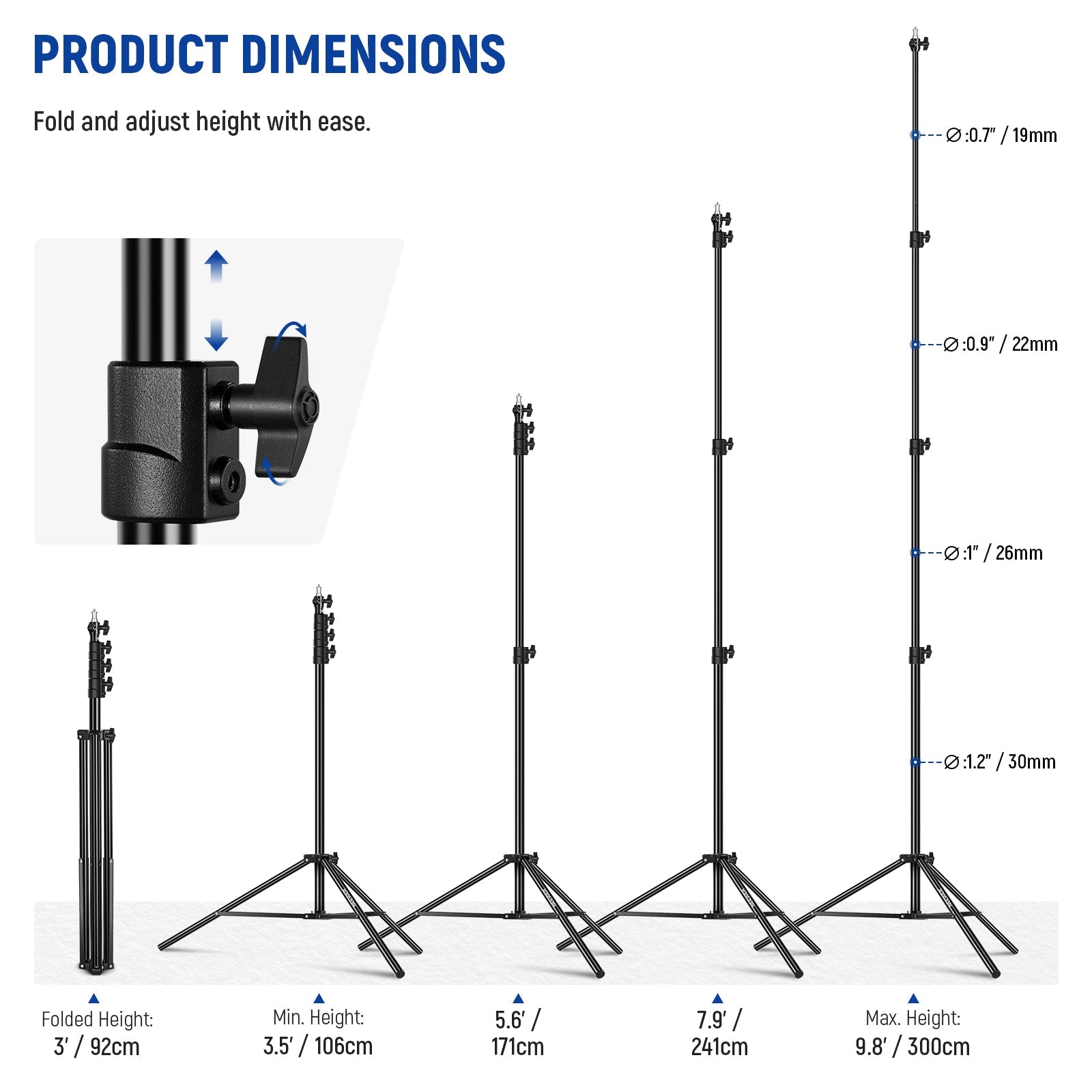 - Semplice regolazione dell'altezza: solleva la colonna centrale telescopica a 4 sezioni da 3,5 piedi a 9,8 piedi (da 106 cm a 300 cm) e fissala con le manopole in metallo per una forza di bloccaggio eccezionale. L'ampia gamma di altezze consente un posizionamento flessibile del dispositivo mentre il design pieghevole rende il trasporto e lo stoccaggio senza sforzo