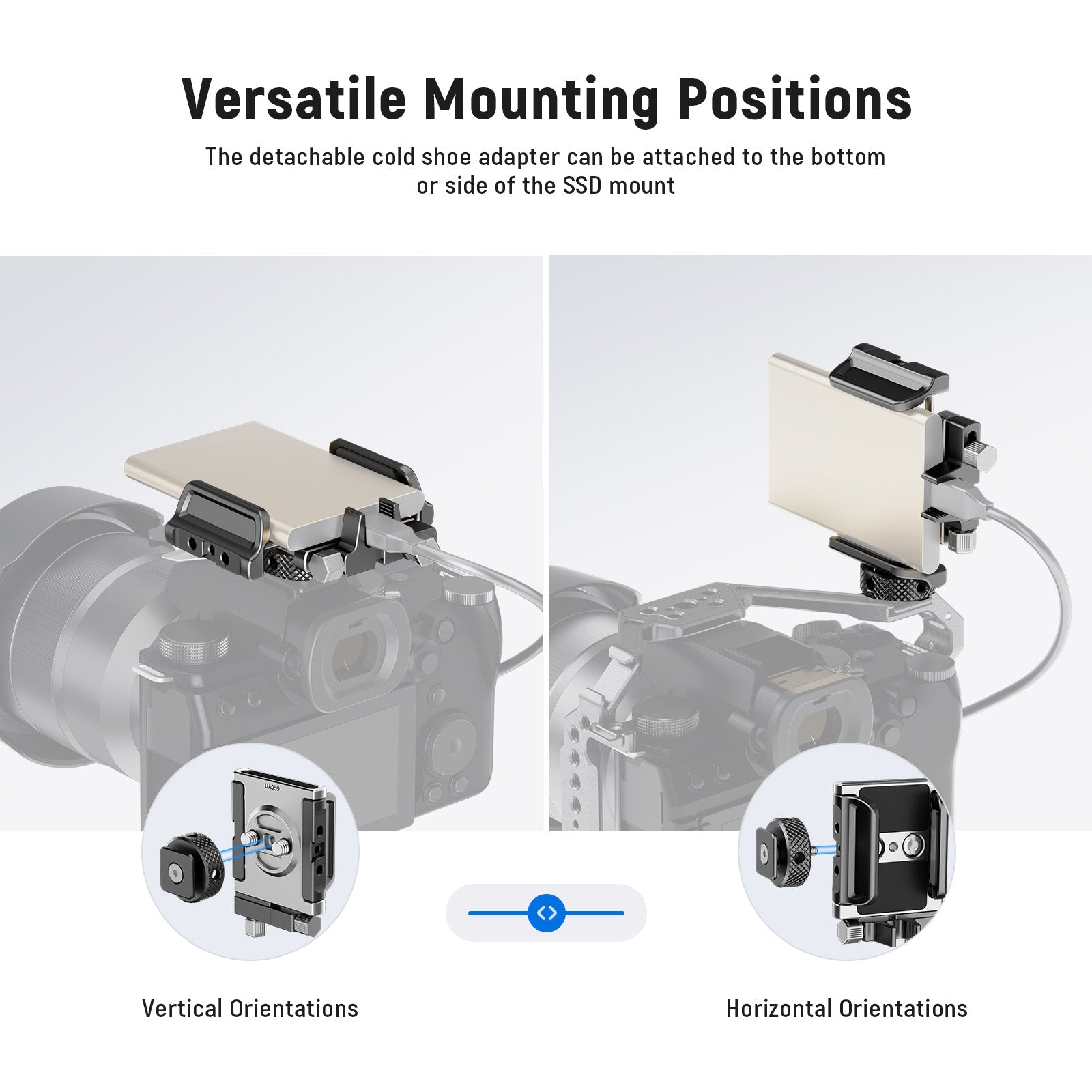 - Posizioni di montaggio versatili : l'adattatore per slitta a freddo staccabile può essere fissato alla parte inferiore o laterale del supporto SSD, consentendo di installare il supporto SSD su una gabbia per fotocamera, una maniglia superiore e un supporto per treppiede per telefono in verticale o in orizzontale.