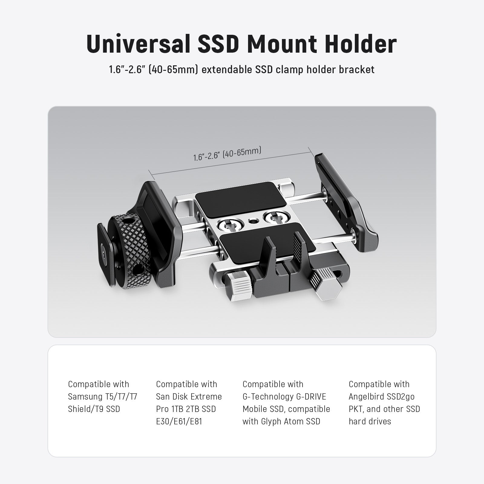 - Supporto universale per SSD : questa staffa estensibile per supporto a morsetto SSD da 1,6"-2,6" (40-65 mm) è compatibile con Samsung T5/T7/T7 Shield/T9 SSD, compatibile con San Disk Extreme Pro 1TB 2TB SSD E30/E61/E81, compatibile con G-Technology G-DRIVE Mobile SSD, compatibile con Glyph Atom SSD, compatibile con Angelbird SSD2go PKT e altri dischi rigidi SSD.