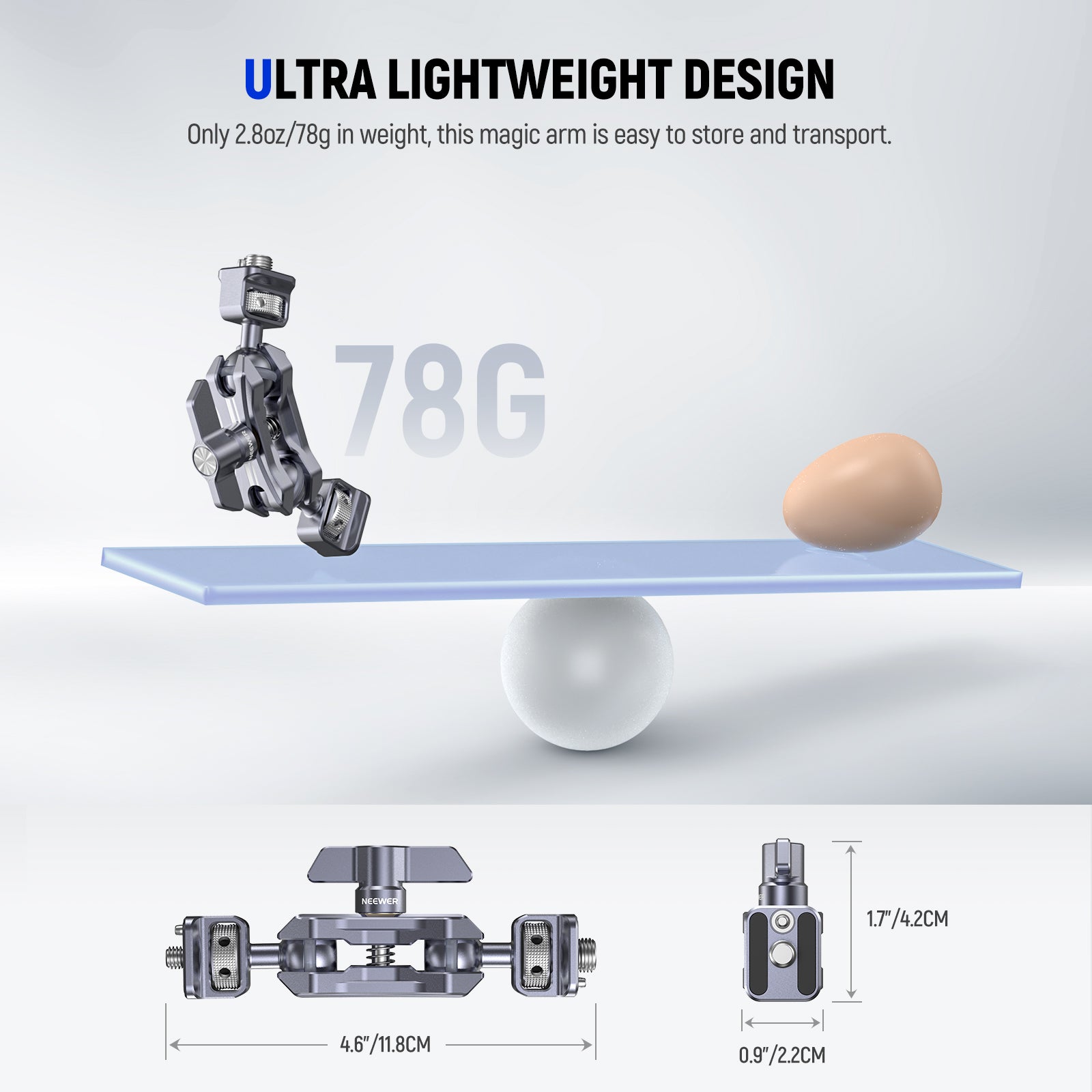 - Design ultraleggero - Ottimizzato con un peso ridotto (2,8 once/78 g), questo braccio magico è più ideale per la fotografia all'aperto, la realizzazione di film, il vlogging e lo streaming live. Con dimensioni di 4,6"x1,7"x0,9"/118x42x22 mm, è portatile e facile da inserire nella borsa