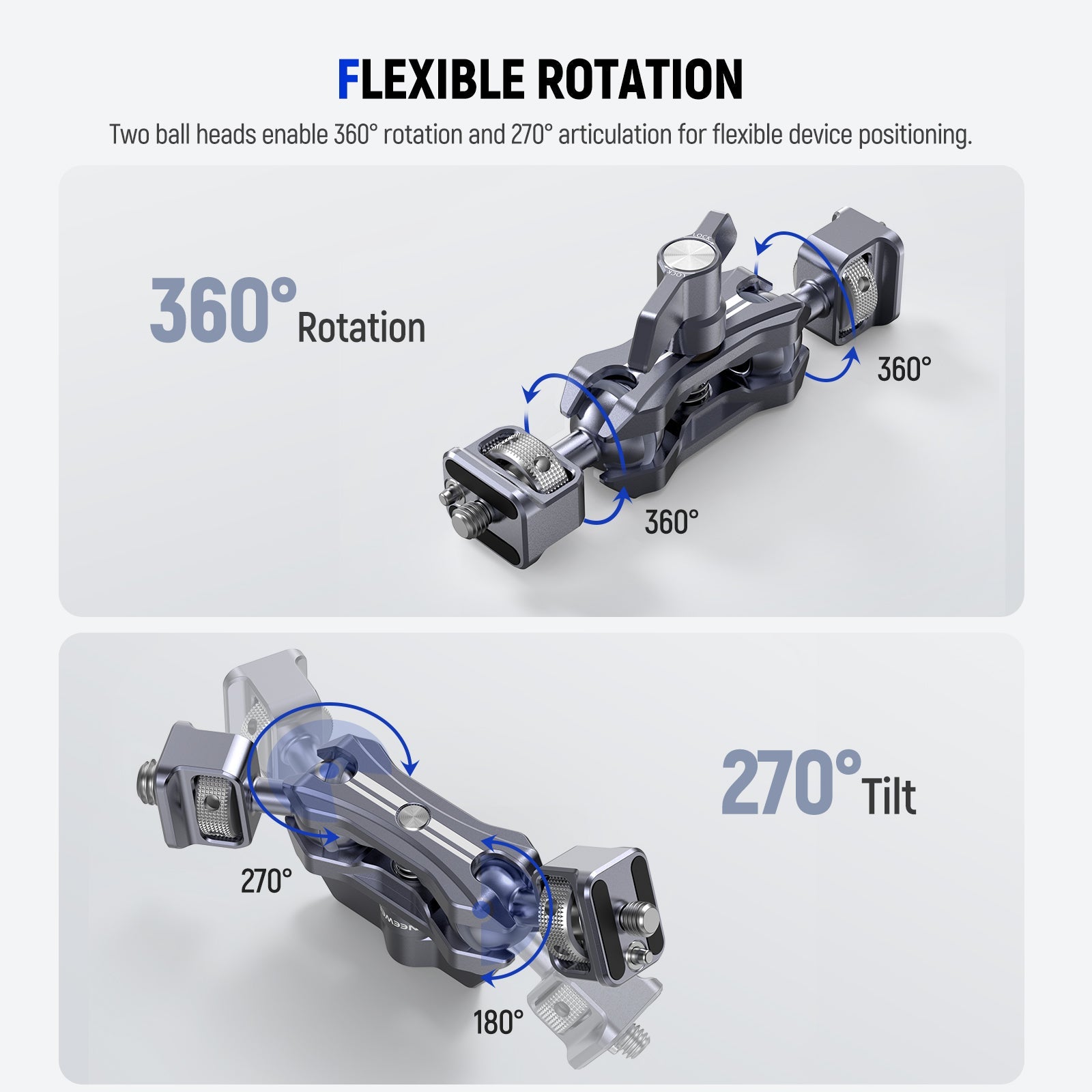 - Rotazione a 360° e inclinazione a 270° : questo supporto per fotocamera con braccio magico con due teste a sfera consente la rotazione a 360° e l'inclinazione a 270° per un posizionamento flessibile. Gli anelli di gomma aumentano l'attrito per una maggiore sicurezza