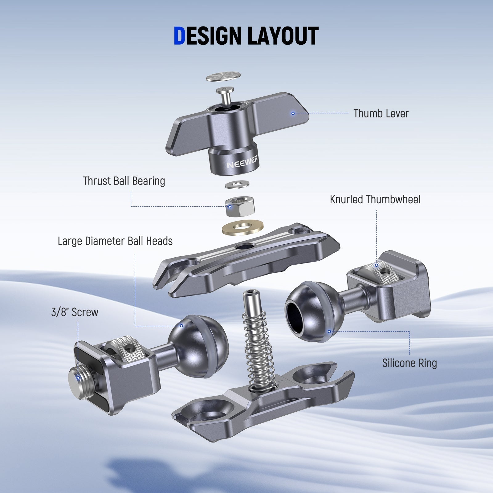 - Semplice regolazione dell'angolo : una singola manopola a vite allenta o stringe senza sforzo entrambe le teste a sfera per un posizionamento rapido ed efficiente. Se un ostacolo si frappone, puoi estrarre la manopola, cambiarne l'angolazione e continuare a stringere la vite