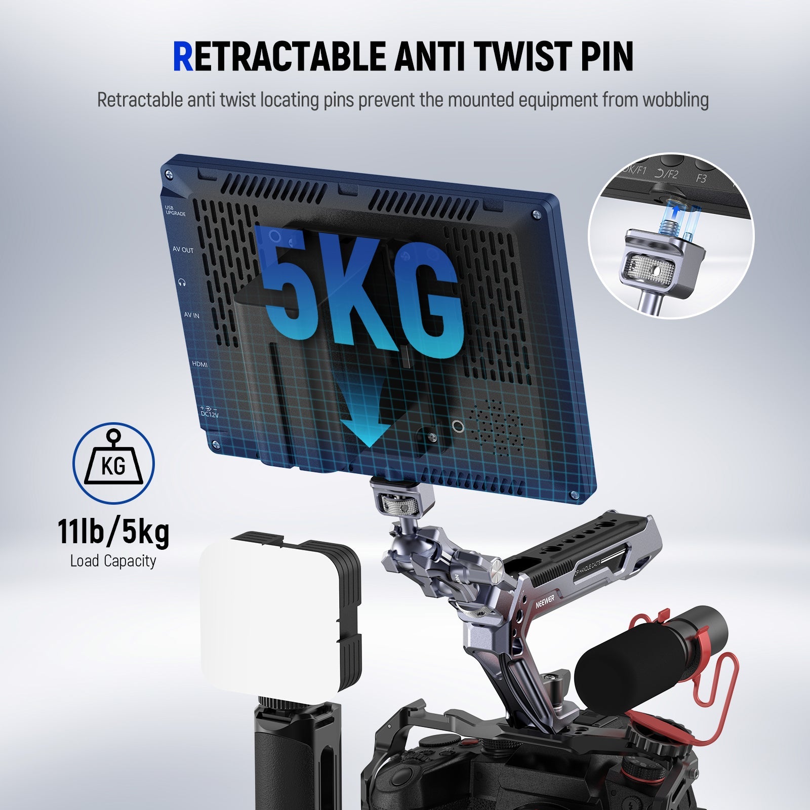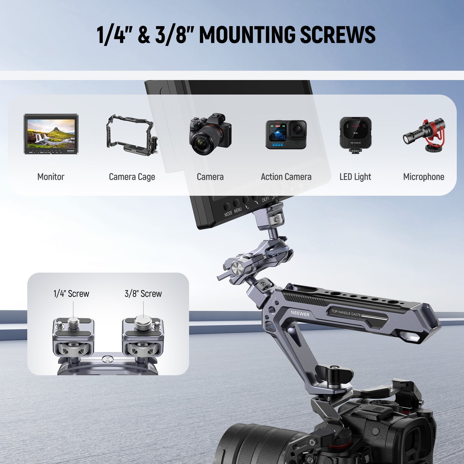 - Viti di montaggio da 1/4" e 3/8" : le viti da 1/4" e 3/8" sono compatibili con una gamma di dispositivi fino a 5 kg/11 libbre, inclusi monitor da campo, luci video LED, microfoni, action cam e mirrorless macchine fotografiche. Compatibile anche con gabbie per fotocamere SmallRig e NEEWER, piattaforme video e super morsetti