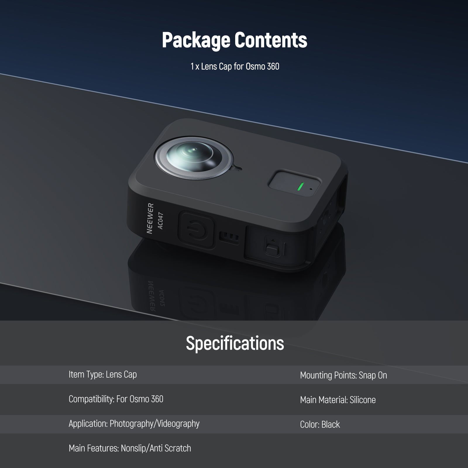 - Struttura in silicone e antigraffio : realizzati in morbido silicone antiscivolo, il copriobiettivo in silicone Osmo 360 e la custodia protettiva proteggono il tuo accessorio fotografico da urti, graffi, acqua e sporco, prolungandone la durata.