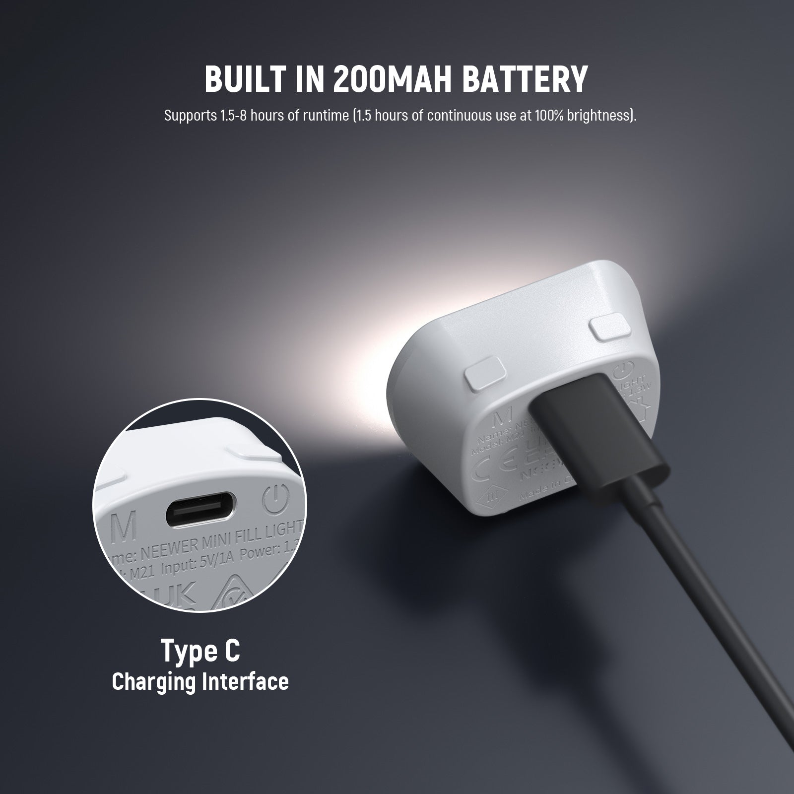 Batteria integrata da 200 mAh : la luce LED per fotocamera è dotata di una batteria ricaricabile integrata da 200 mAh, che supporta un'autonomia di 1,5-8 ore (1,5 ore di utilizzo continuo al 100% di luminosità). Si ricarica comodamente tramite un caricabatterie portatile o altre fonti di alimentazione USB tramite la porta USB-C.