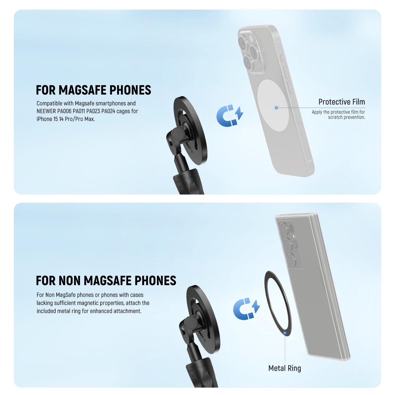 - Supporto magnetico universale per telefono - Realizzato con magneti di qualità superiore, il morsetto magnetico per telefono ha una potente e potente aspirazione, assicurando che il tuo dispositivo sia stabile e sicuro, compatibile con la serie MagSafe iPhone 15 Pro Max Plus 14 13 12. Per gli smartphone non magnetici, sono forniti 2 anelli metallici magnetici da attaccare alla custodia del cellulare, consentendo al supporto del cellulare di essere adatto a quasi tutti gli smartphone