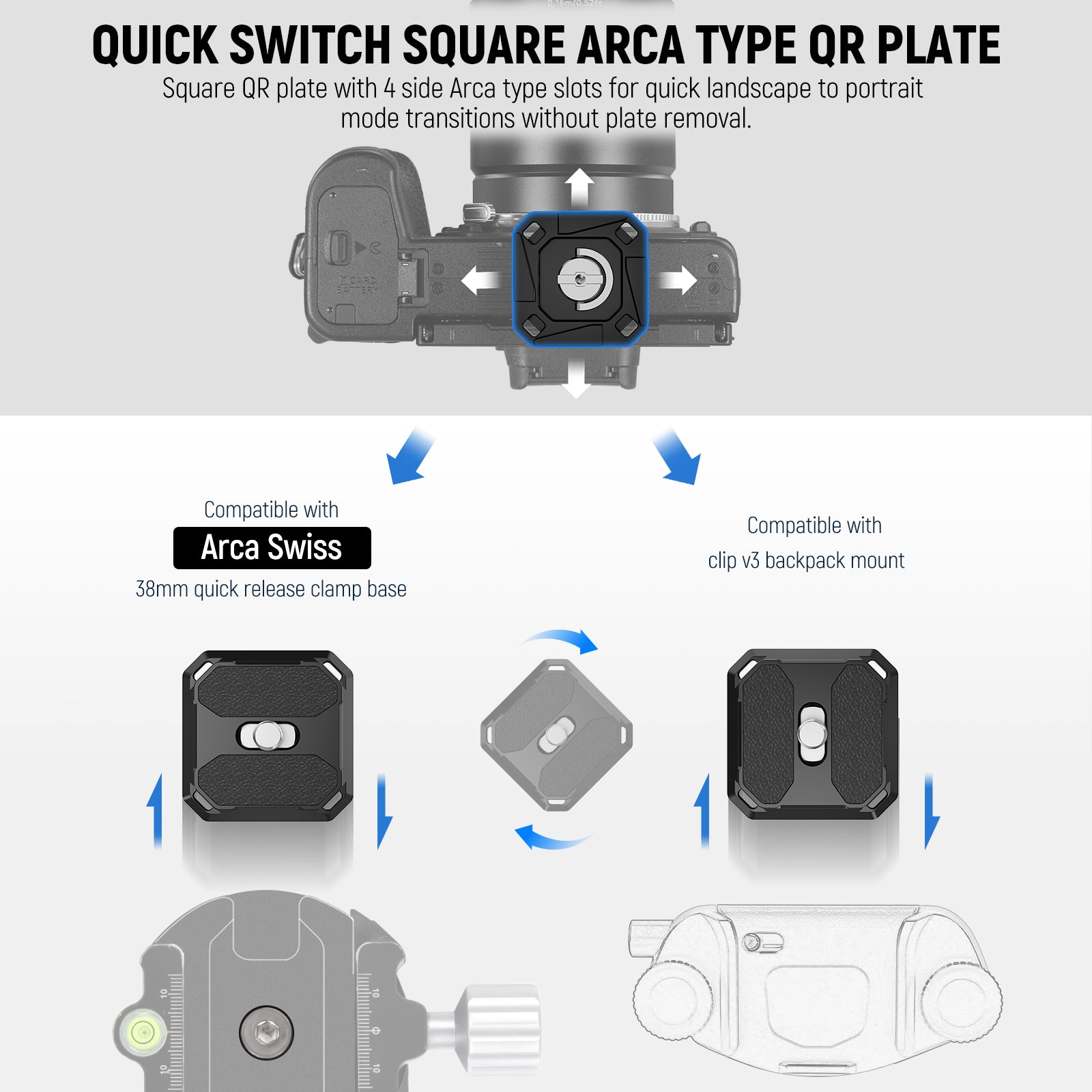 - Versatili slot Arca su quattro lati - Dotata di quattro slot Arca su quattro lati, questa piastra a sgancio rapido quadrata consente un'installazione senza problemi da qualsiasi direzione, consentendo transizioni fluide tra modalità orizzontale e verticale. Monta la tua fotocamera o altre apparecchiature in vari orientamenti senza frequenti rimozioni e riattacchi, risparmiando tempo e fatica.