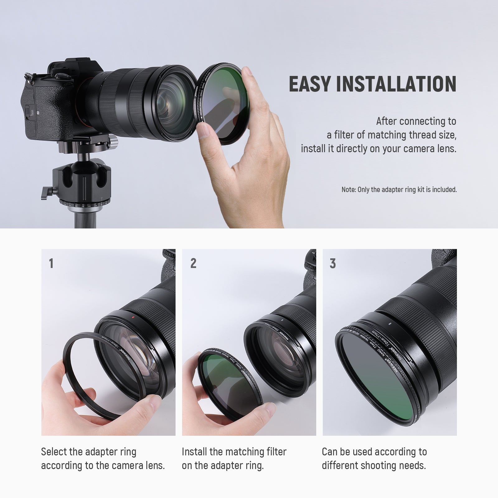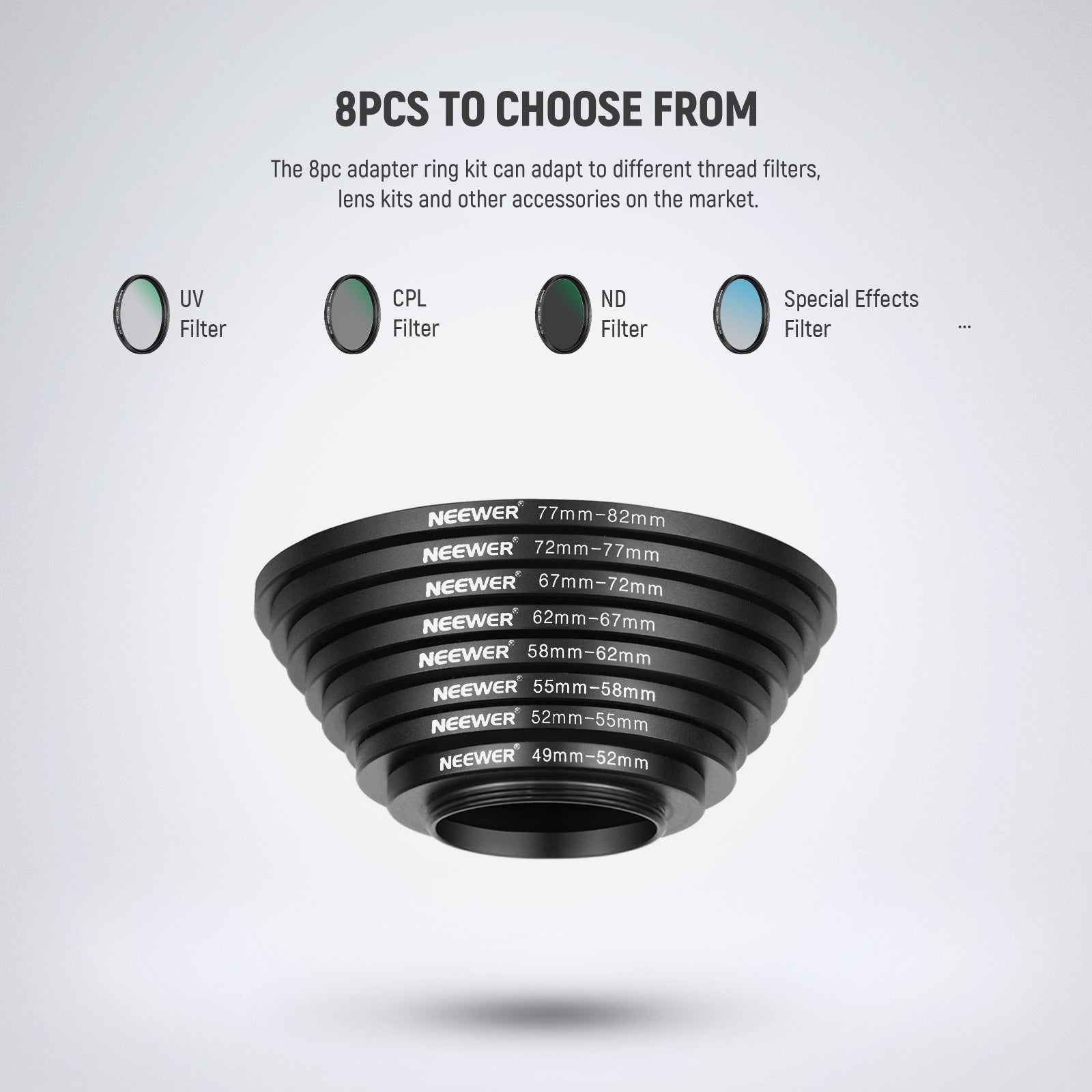 • Il set di anelli adattatori per filtri step-up di Neewer può essere facilmente avvitato sulla parte anteriore di qualsiasi obiettivo e convertire la dimensione della filettatura dell'obiettivo in quella di qualsiasi altro accessorio (come filtri, paraluce, flash e convertitori per obiettivi).