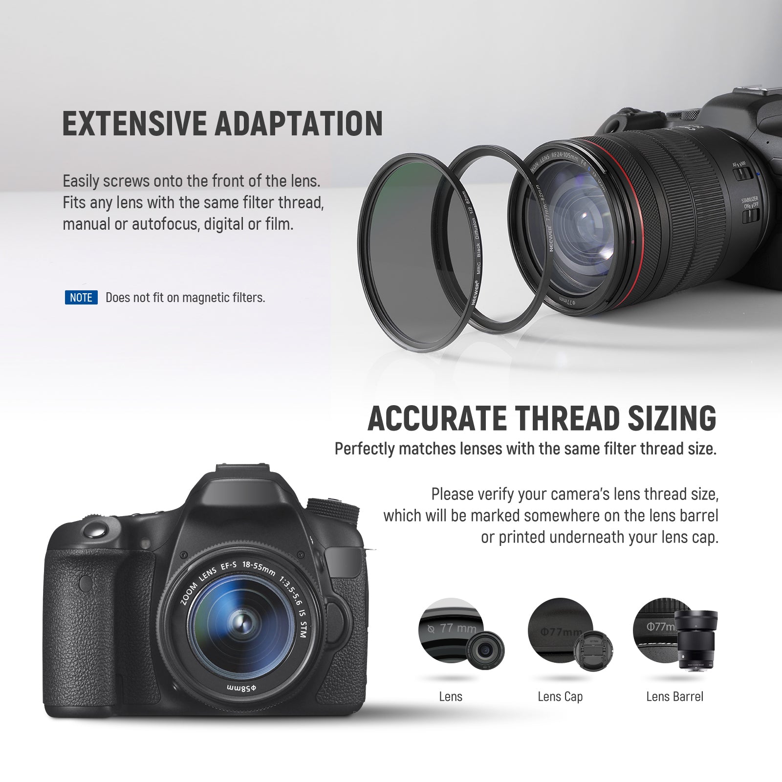 • Adatto a qualsiasi obiettivo con la stessa filettatura del filtro, manuale o autofocus, digitale o a pellicola.