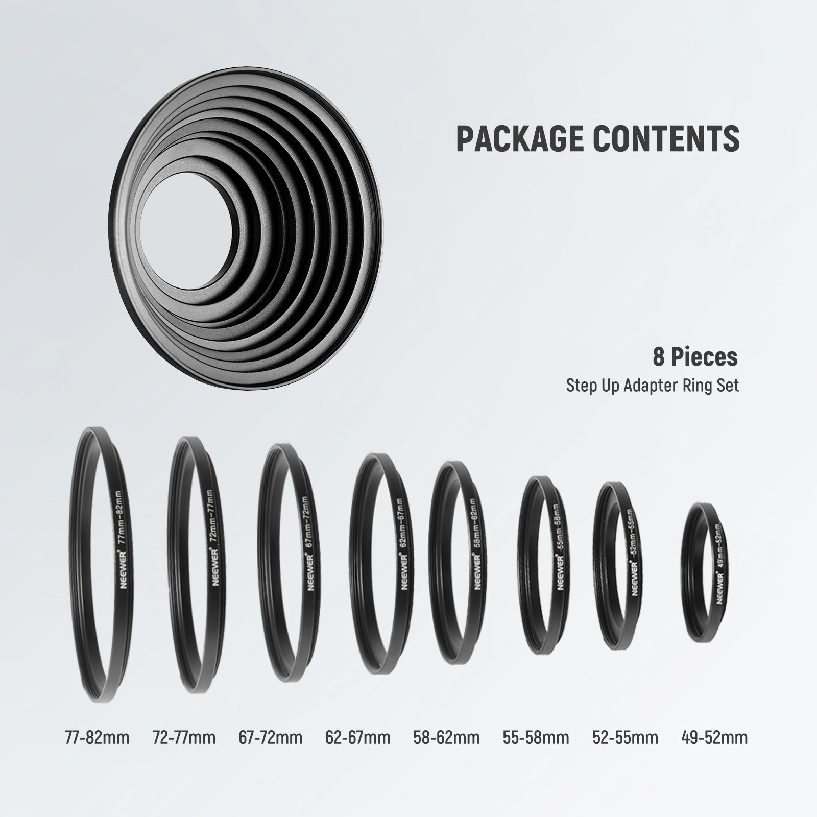 • Il set di anelli step-up include: (1) anello step-up da 49-52 mm + (1) anello step-up da 52-55 mm + (1) anello step-up da 55-58 mm + (1) anello step-up da 58-62 mm + (1) anello step-up da 62-67 mm + (1) anello step-up da 67-72 mm + (1) anello step-up da 72-77 mm + (1) anello step-up da 77-82 mm.