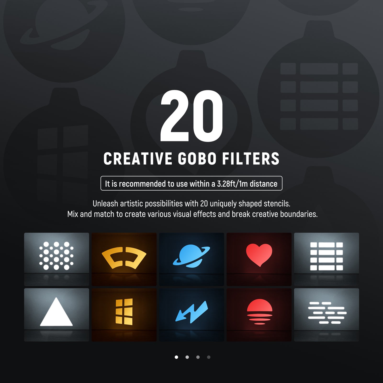 - 4 Colori di Luce e 20 Filtri Gobo - Il faretto fotografico è dotato di LED a 4 colori: bianco caldo, giallo arancio, blu ghiaccio e un'affascinante luce rossa. Include 20 tipi di filtri gobo per vari effetti. Con una potenza di 10 W, offre luce gialla fino a 1620Lx/0,5 m (2000K), luce bianca calda con un elevato CRI95+ e TLCI96+ per colori fedeli, con dimmerazione dall'1% al 100%. Kit di illuminazione per sfondo o soft key per servizi fotografici in studio, prodotti, podcast video, riprese, foto di matrimoni, vlog e streaming live.