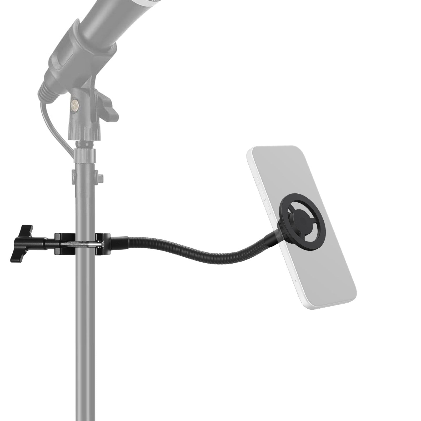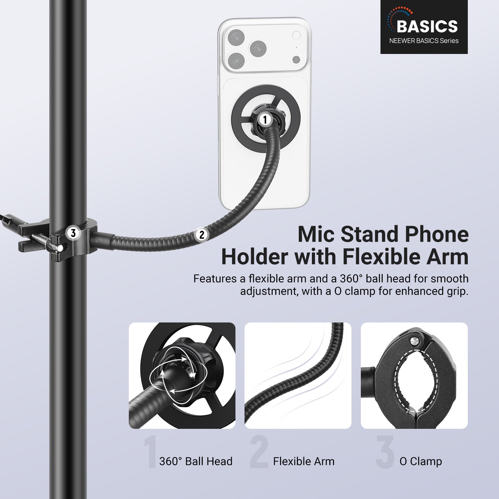 • Supporto per telefono con braccio flessibile - Il supporto per microfono è dotato di un braccio flessibile e di un morsetto a O, entrambi realizzati in robusta lega di alluminio, per fissare saldamente il telefono al supporto per microfono, garantendo un'eccellente stabilità. Il tubo flessibile e la testa a sfera in metallo consentono regolazioni fluide, mentre il supporto per telefono aderisce saldamente al dispositivo, ideale per vlog, streaming live, registrazione audio e video, podcast e altri tipi di riprese video.