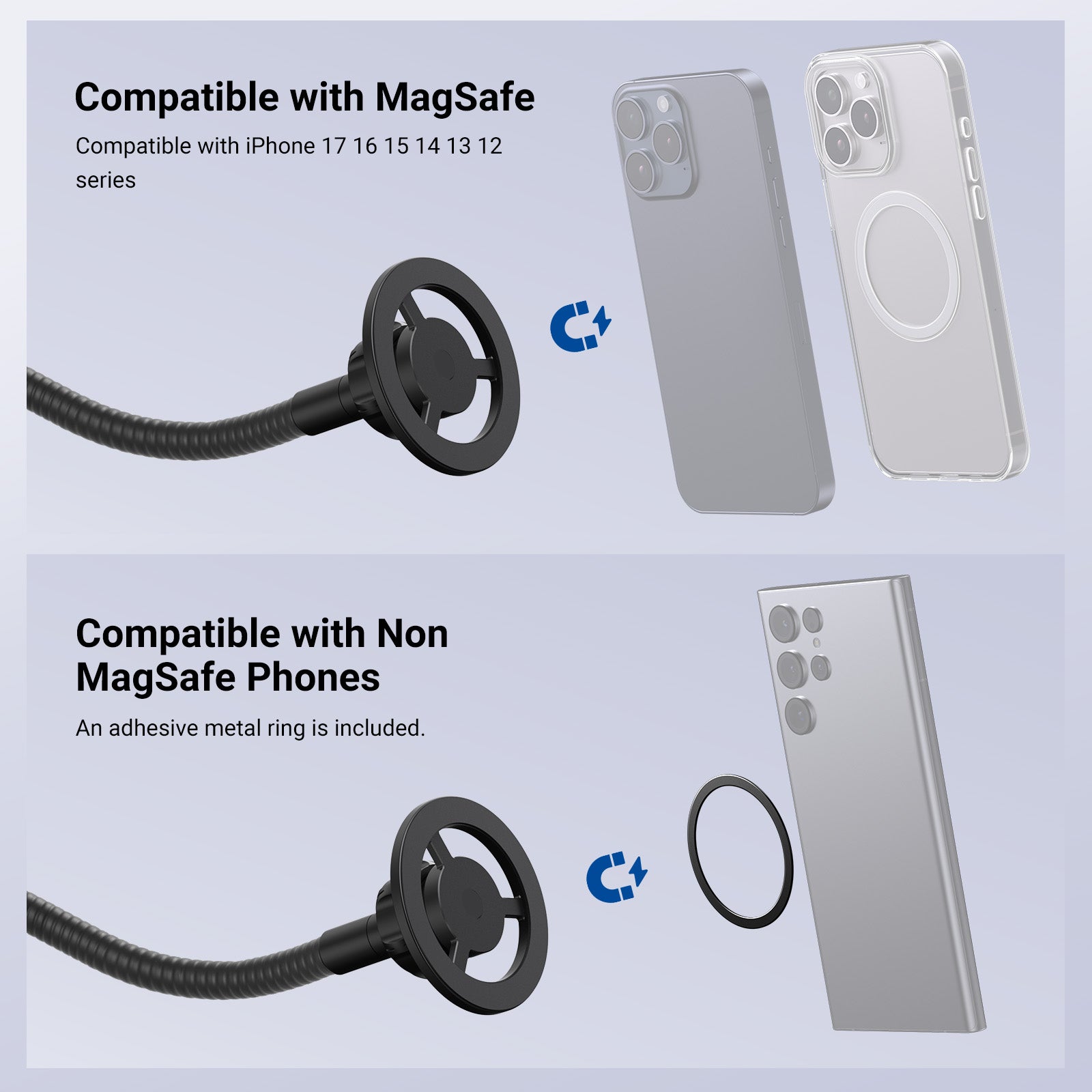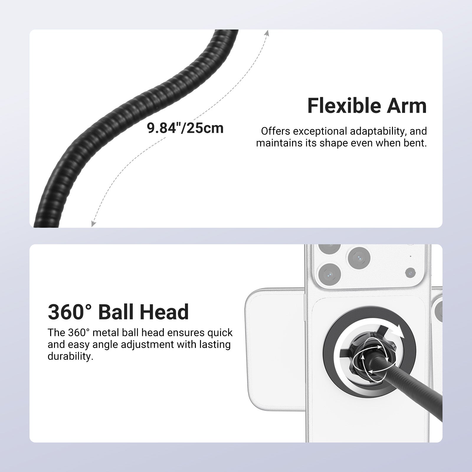 • Regolazione flessibile e fluida : il braccio flessibile da 7,9" (20 cm) offre un'adattabilità eccezionale, mantenendo la sua forma anche quando piegato, con una testa a sfera girevole a 360° sulla parte superiore, che garantisce che il telefono rimanga saldamente a qualsiasi angolazione o altezza desiderata. Che si tratti di discorsi, riunioni, karaoke, canto sul palco, esibizioni di band, registrazioni in studio o streaming live e lezioni online, il supporto per telefono con clip è sempre a portata di mano.