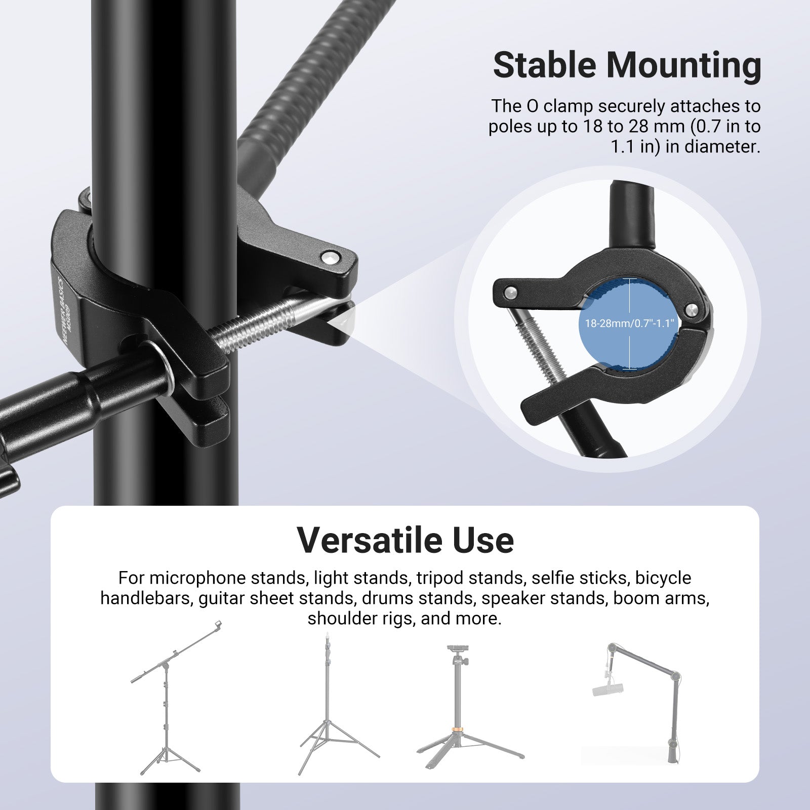 • Montaggio stabile e utilizzo versatile : si fissa saldamente a un palo con un diametro fino a 18-28 mm (da 0,7" a 1,1"), il morsetto di tipo O è adatto per supporti per microfono, supporti per luci, supporti per treppiedi, selfie stick, manubri per biciclette, supporti per spartiti per chitarra, supporti per batteria, supporti per altoparlanti, bracci a braccio, supporti per spalle e altro ancora.