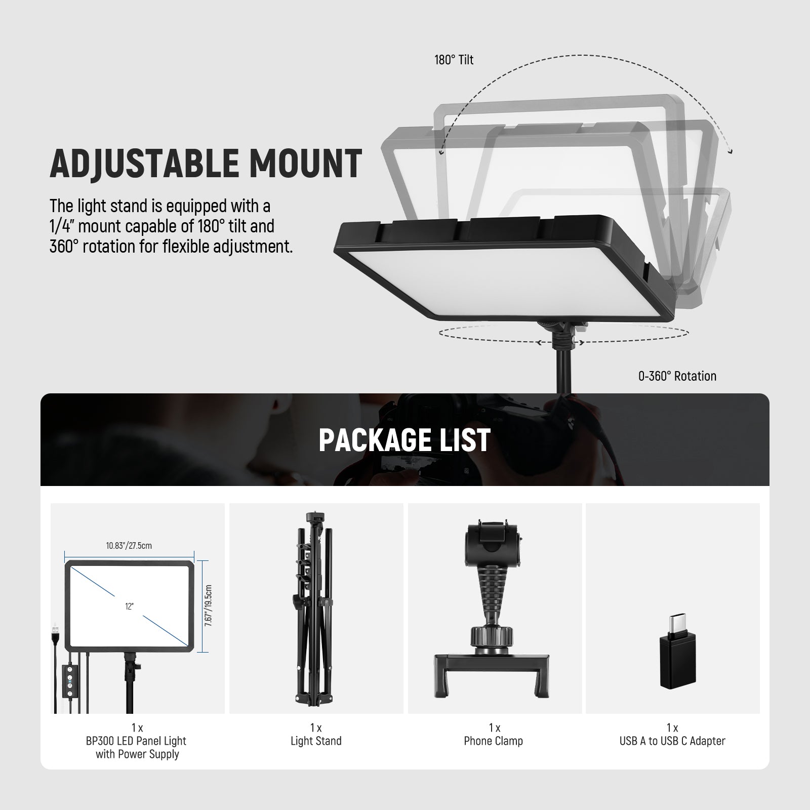 - Cavo di alimentazione e controllo integrato - Il sottile pannello luminoso a LED, spesso 2,8 cm, è compatto e facile da trasportare. Ogni luce video a LED è dotata di un cavo di alimentazione lungo 2 m, integrato con un controller di illuminazione per una gestione ottimale. Grazie all'ingresso USB A 5 V/2 A, la luce può essere alimentata tramite un adattatore da parete USB 5 V/2 A, un caricabatterie portatile, un computer desktop o un laptop tramite l'adattatore da USB A a USB C incluso.