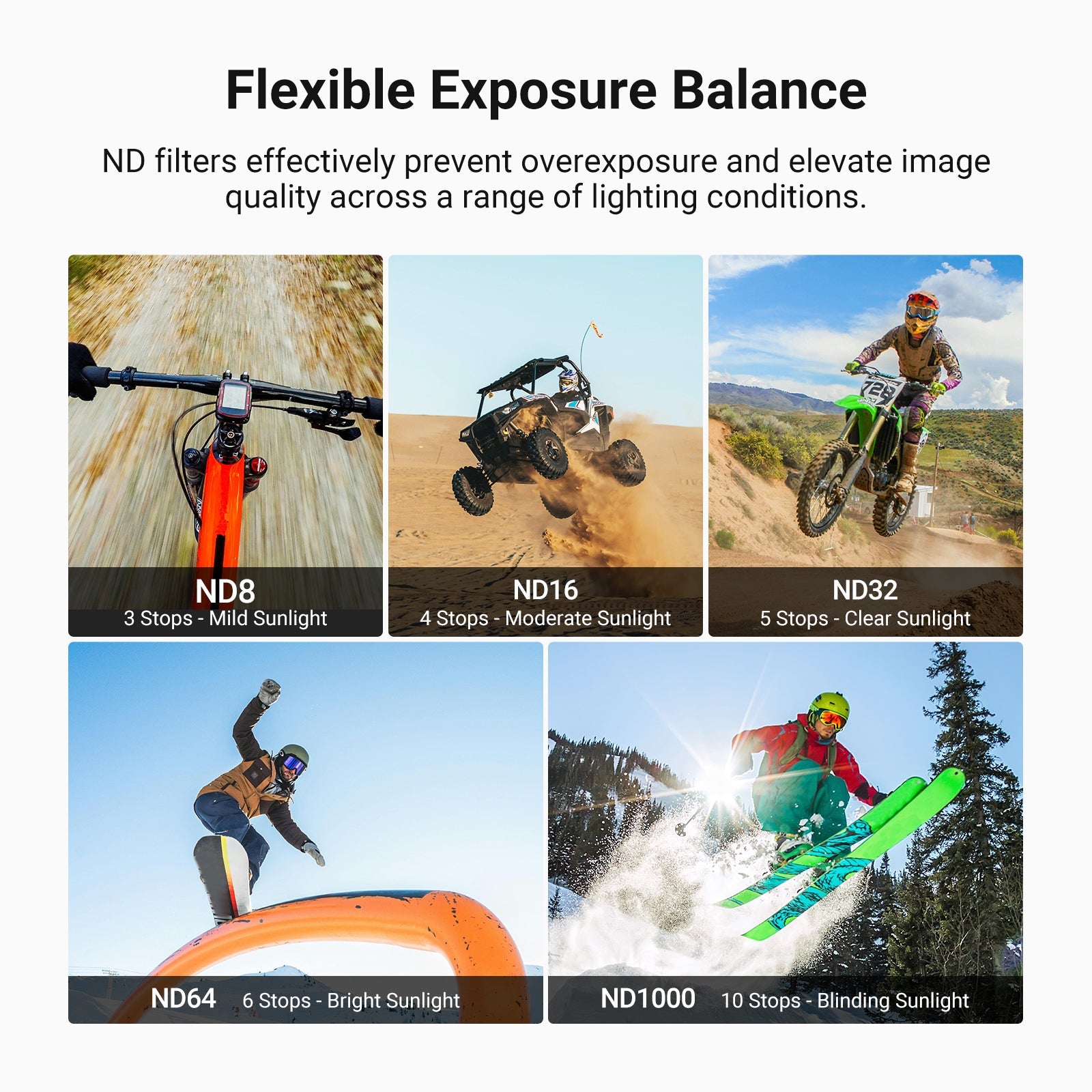 - Controllo flessibile dell'esposizione : i filtri a densità neutra ND8, ND16 e ND32 forniscono 3, 4 e 5 stop di riduzione della luce, consentendo un'esposizione bilanciata in vari ambienti ed effetti creativi di sfocatura del movimento