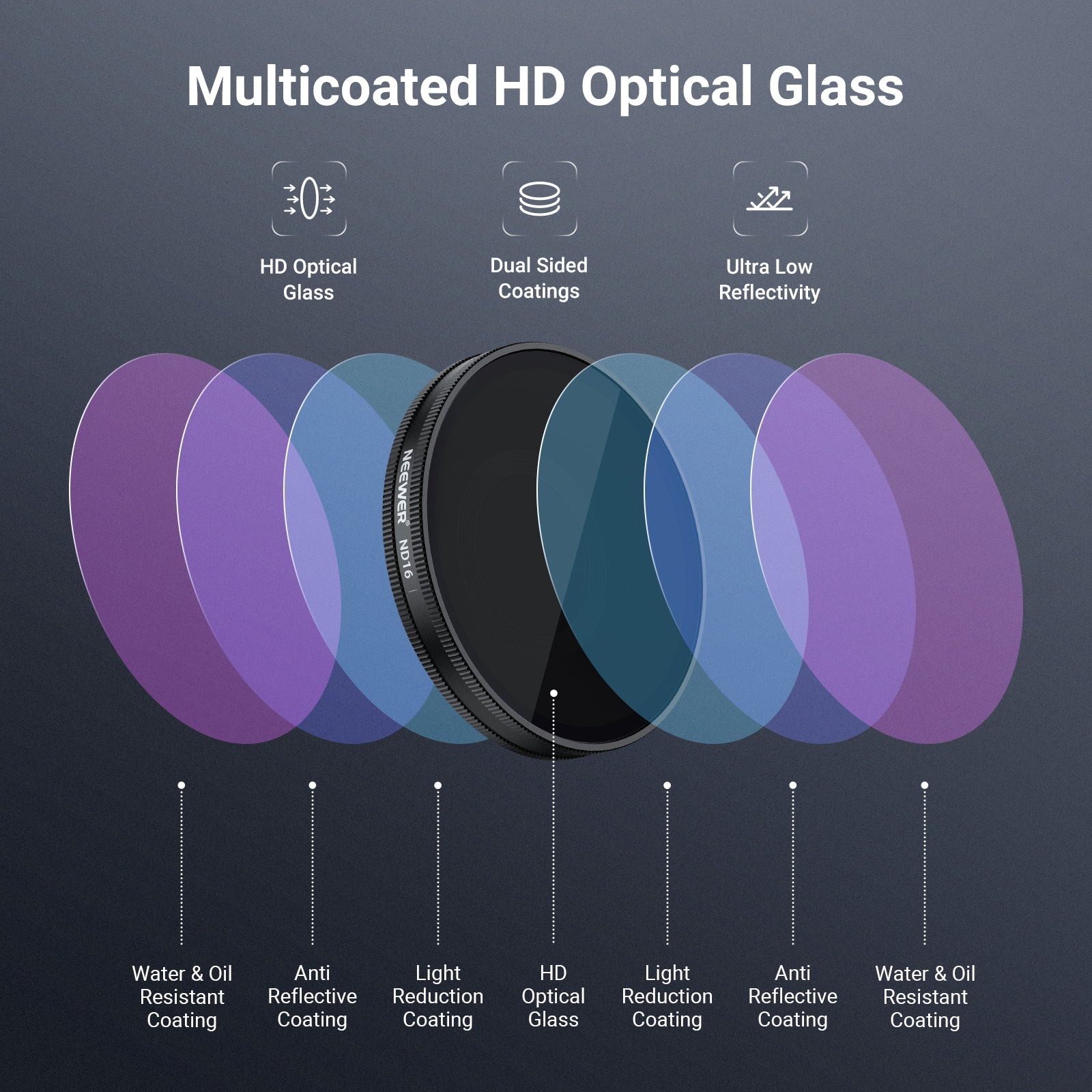 - Vetro ottico HD multistrato : il vetro ottico HD garantisce un'eccezionale nitidezza delle immagini. I molteplici rivestimenti protettivi su entrambi i lati resistono all'acqua, ai graffi e alle impronte digitali.