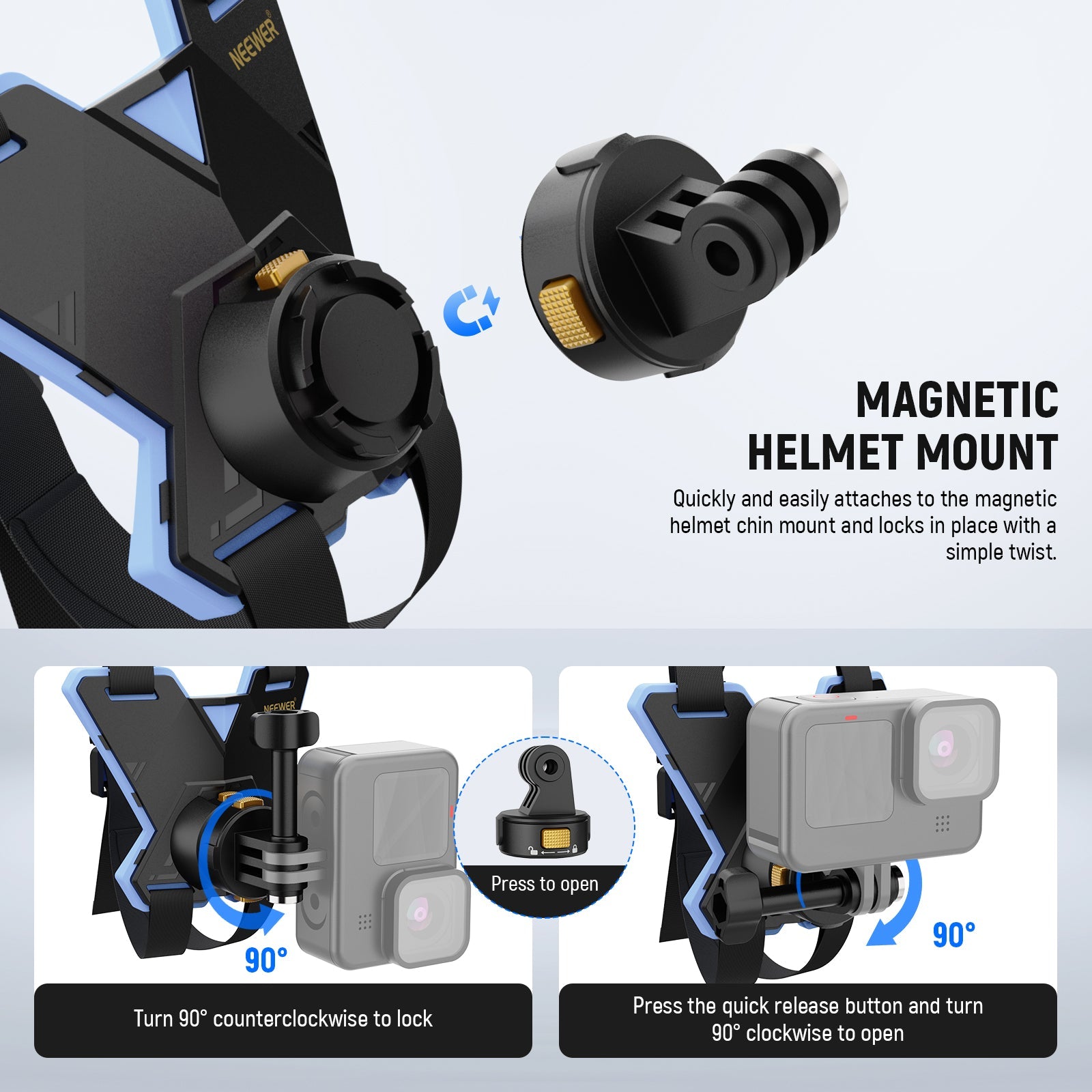 - Per Action Camera - Il kit di accessori per il supporto fotografico per casco da moto GP19 è compatibile con GoPro Hero13 Hero 12 go pro 11 10 9 8 7 Black Max, compatibile con DJI Osmo Action 5 Pro 4 3 2, compatibile con Insta360 Go 3 2 Go 3S x4 x3 ONE R insta 360 Ace Pro, compatibile con AKASO brave 8 7 4 combo, ecc., utilizzando l'adattatore di montaggio a sgancio rapido magnetico e un adattatore di montaggio extra con una vite da 1/4". Compatibile anche con il sistema di sgancio rapido NEEWER (2a generazione
