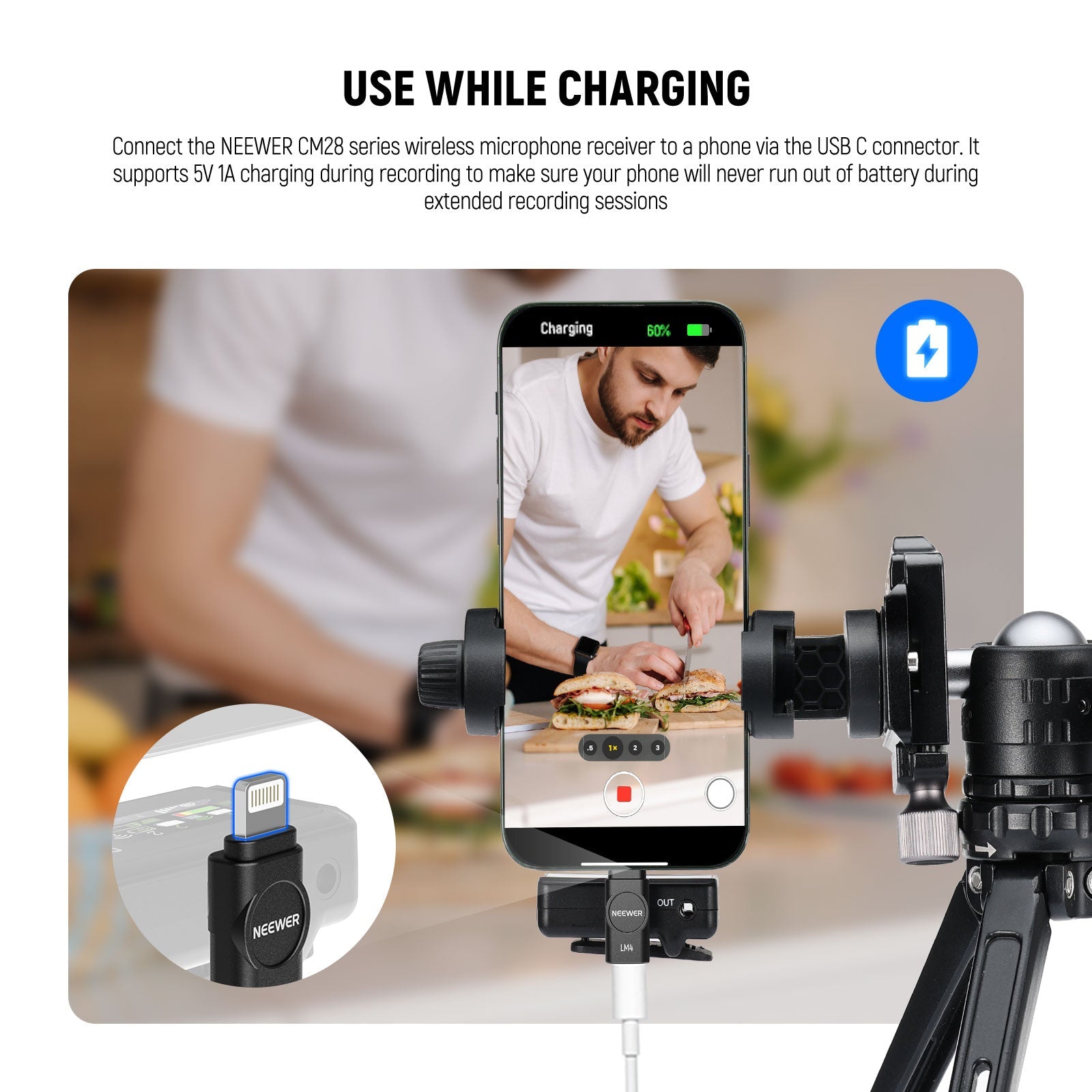 - Come si usa : collega il ricevitore per microfono wireless della serie CM28 di NEEWER a un telefono tramite il connettore USB C. Supporta la ricarica a 5 V 1 A durante la registrazione per garantire che il telefono non si scarichi mai durante sessioni di registrazione prolungate.
