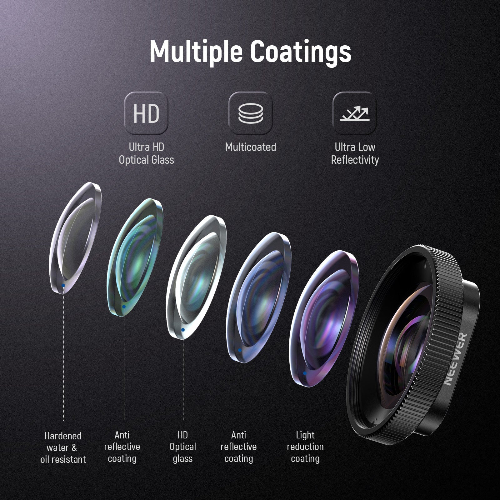 • Vetro ottico HD multistrato antiriflesso - Il vetro ottico HD di alta qualità assicura scatti ravvicinati con elevata nitidezza. I molteplici rivestimenti antiriflesso su entrambi i lati della lente riducono i riflessi e le immagini fantasma, mantenendo colori vivaci e un contrasto migliorato