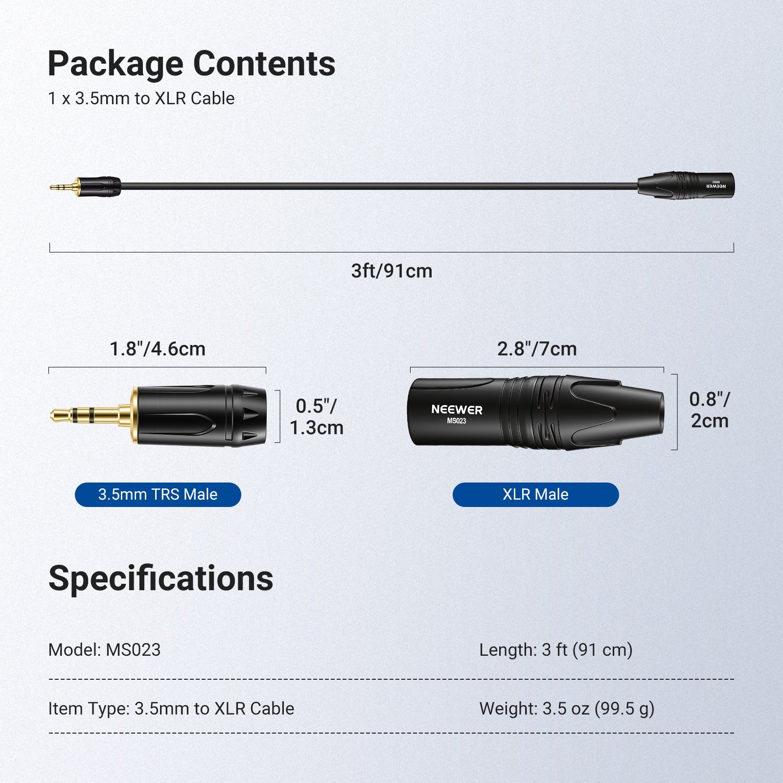 - Lunghezza del cavo 3 piedi (91 cm) - Con una lunghezza di 3 piedi (91 cm), il cavo XLR maschio sbilanciato da 3,5 mm è dotato di una guaina in PVC morbido, che riduce l'ingombro e consente un posizionamento flessibile sulla scrivania, sul supporto o sul mixer