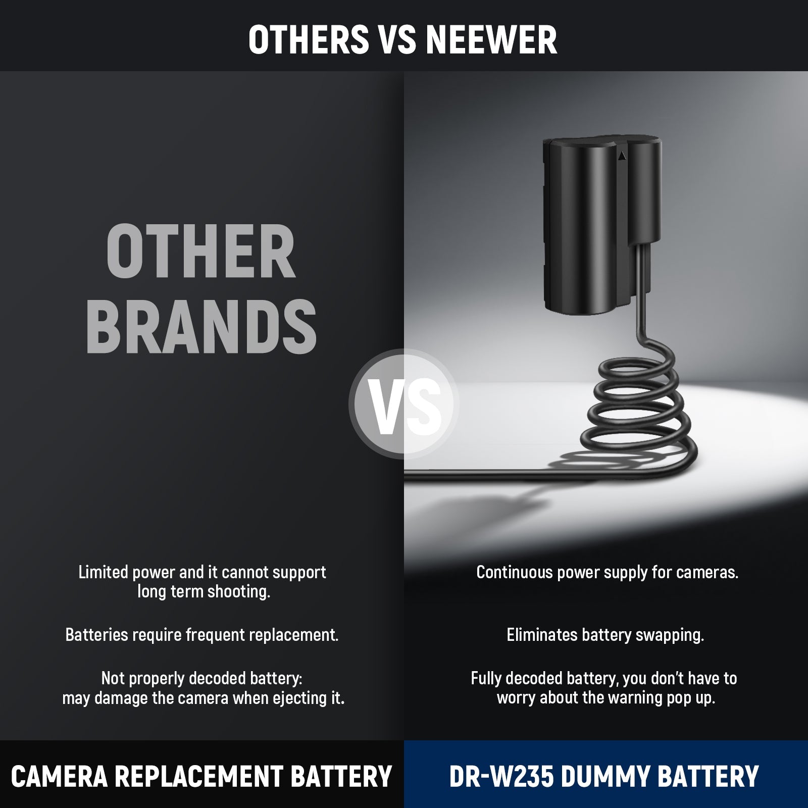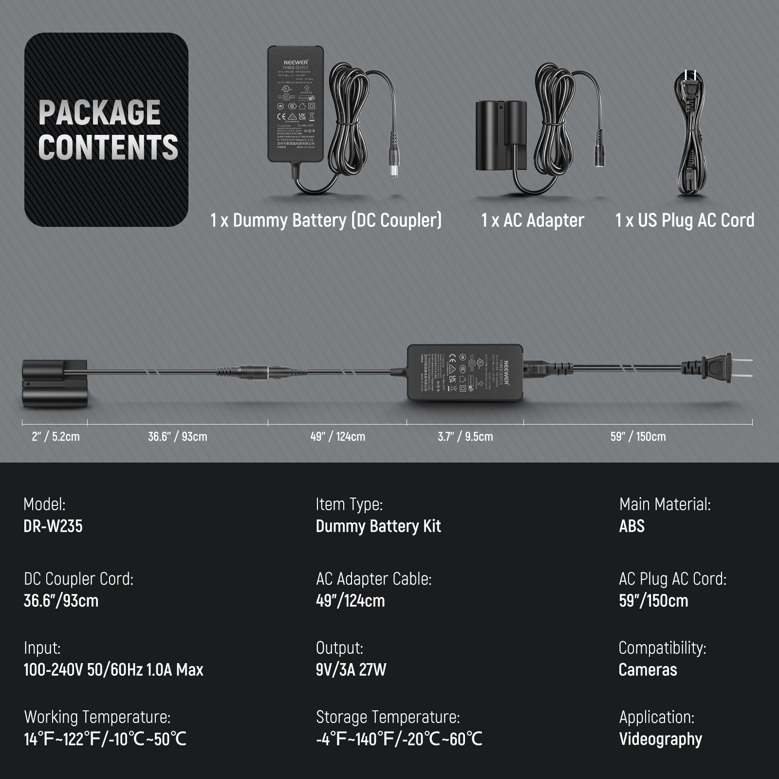 - Alimentazione continua : dì addio ai frequenti cambi di batteria! L'accoppiatore per batteria fittizia di ricambio NEEWER DR-W235, sostituisce le batterie FUJIFILM NP-W235, si collega direttamente all'ingresso di alimentazione della fotocamera per garantire un'alimentazione ininterrotta al tuo dispositivo, bypassando la necessità di batterie tradizionali ma promettendo sessioni di ripresa prolungate