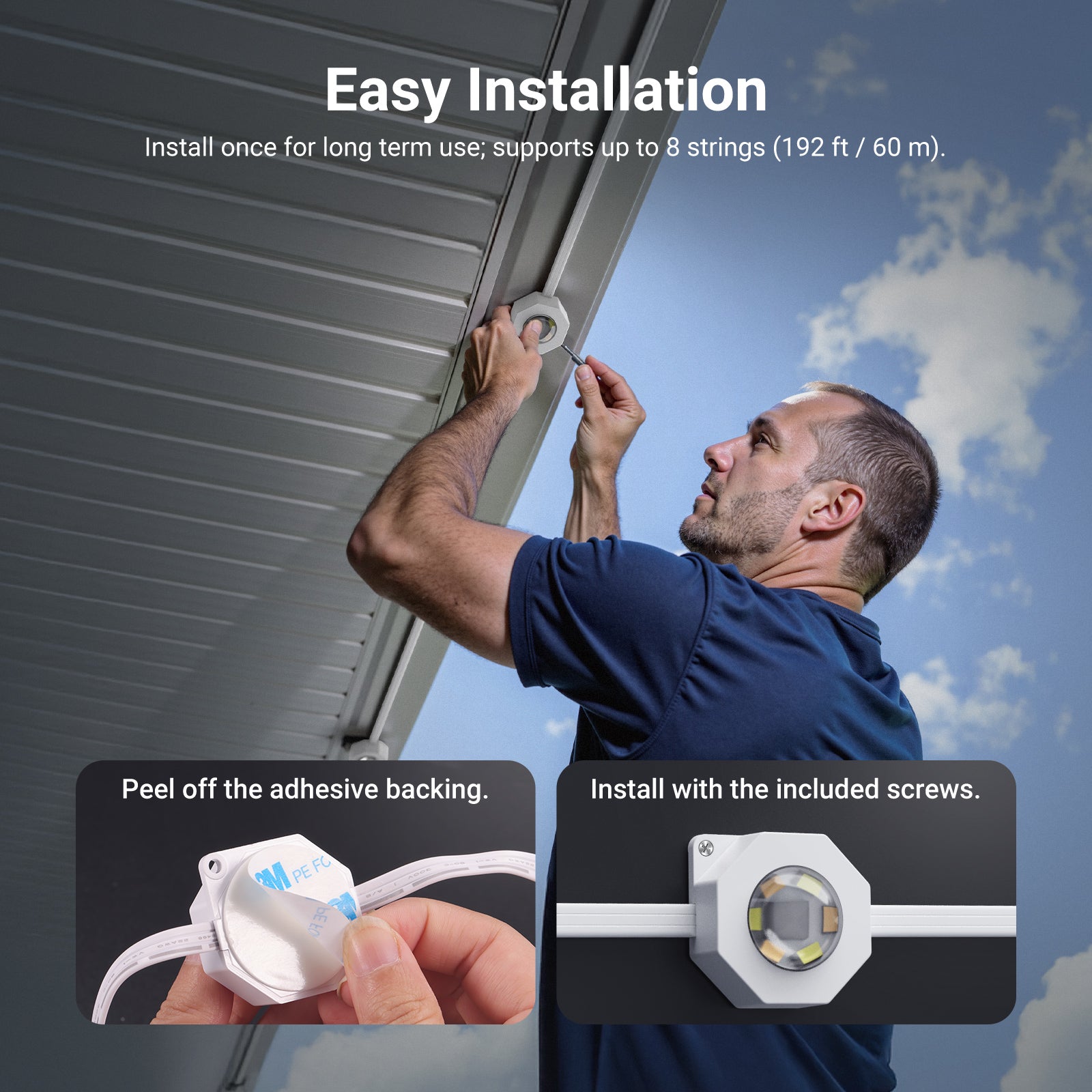 - Facile da installare : ogni piccola luce LED è dotata di un foro per vite e di un supporto adesivo personalizzato, che consente di appendere le luci a filo facilmente sulle grondaie con il kit di viti incluso. È possibile collegare più catene (fino a 8, 60 m) tramite connettori impermeabili per una portata maggiore e un utilizzo flessibile, consentendo un controllo sincronizzato, ideale come elemento essenziale impermeabile per patio esterno e come accessorio decorativo per feste in giardino o mercati. Nota: le catene luminose non possono essere tagliate.