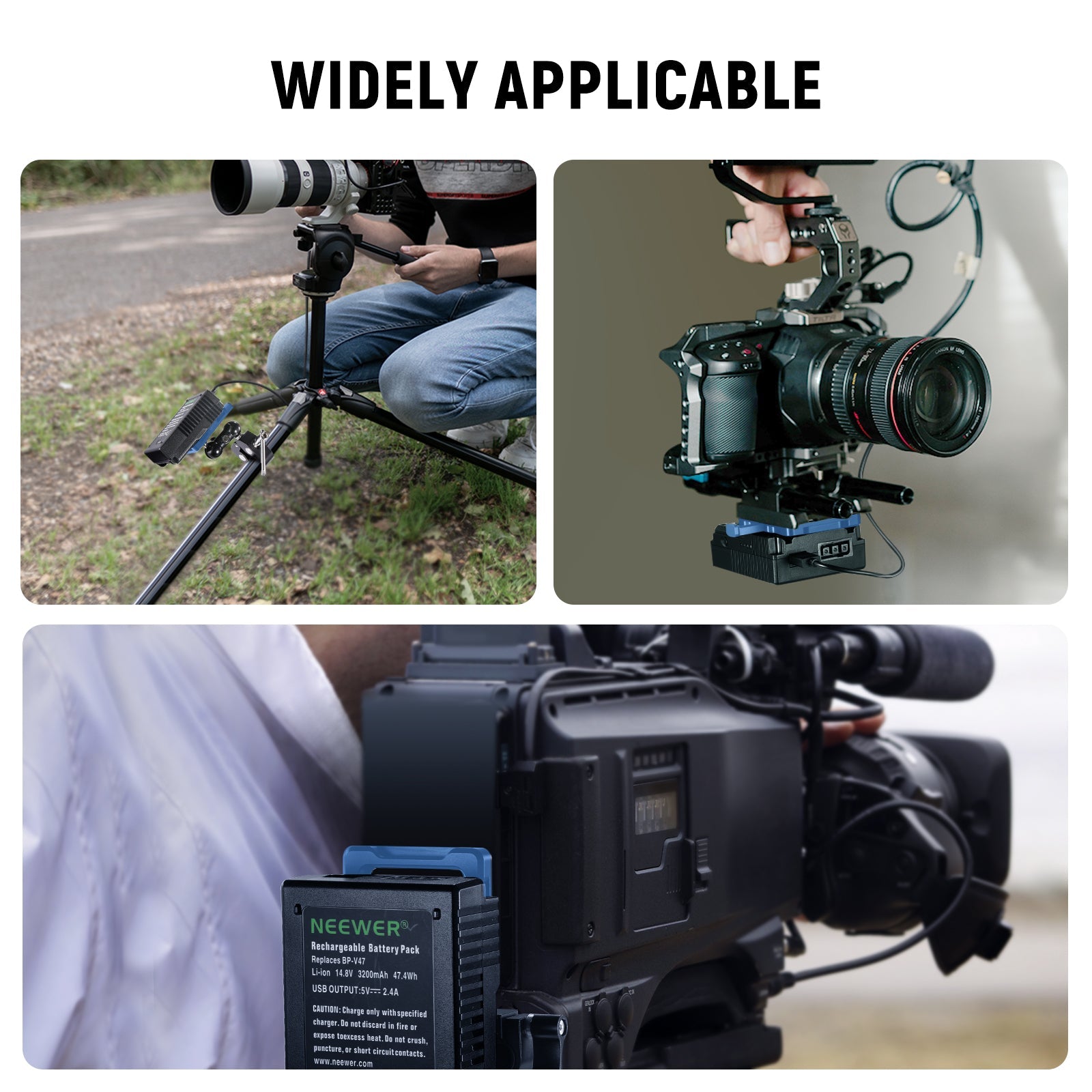 • Piastra batteria con attacco a V - La piastra batteria universale con blocco a V PS005 può funzionare con le batterie NEEWER PS099E BP-95W BP-150WS BP-190WS BP-V47 BP-V95 con blocco a V ed è compatibile con le batterie FXLION Sony con attacco a V e la maggior parte delle altre batterie con attacco a V che funzionano come fonti di alimentazione esterne per fotocamere DSLR/mirrorless, videocamere e monitor. Dispone inoltre di un pulsante di sgancio rapido che consente di montare e rimuovere la batteria in un secondo