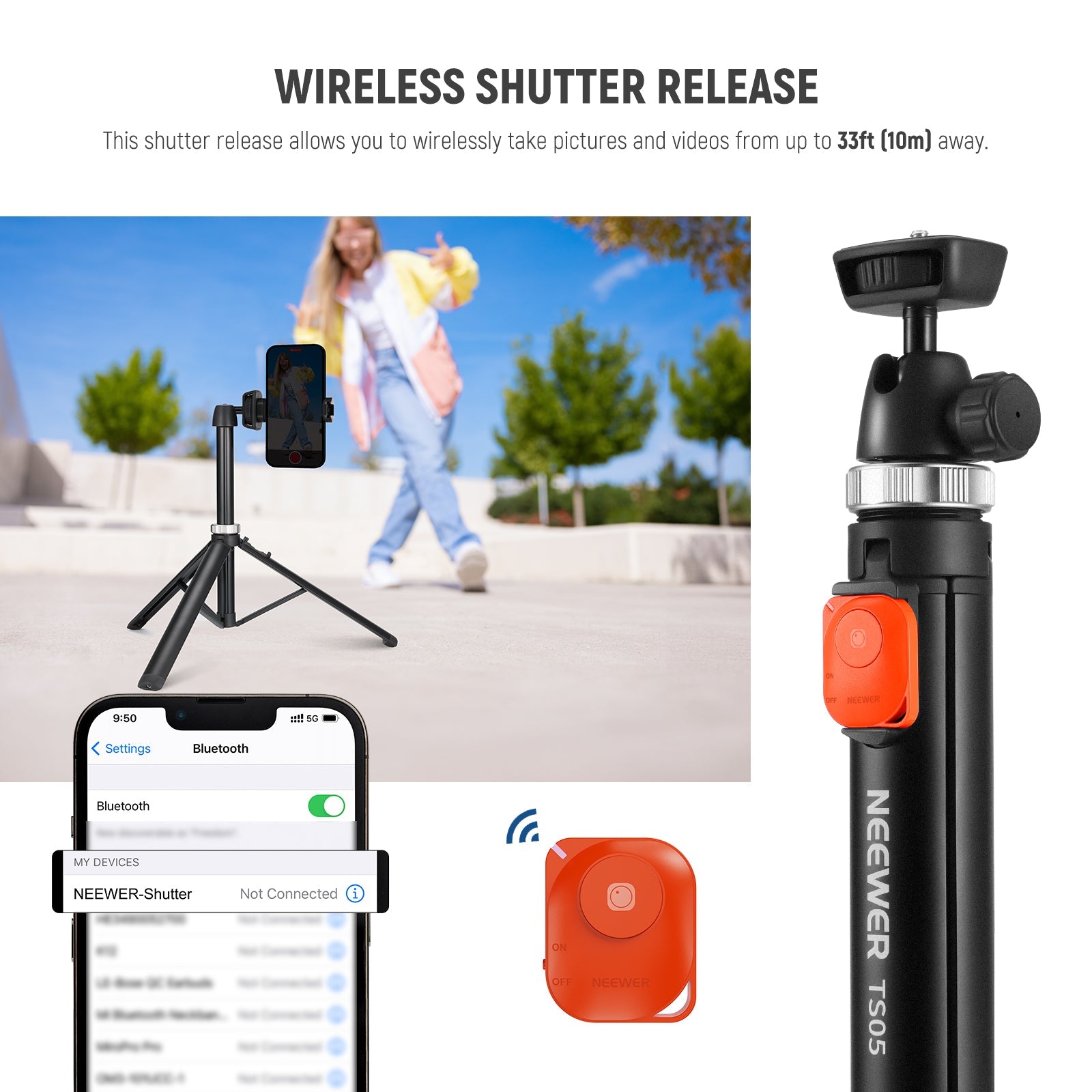 - Comodo scatto Bluetooth - In aree libere, puoi assumere il pieno controllo dell'otturatore della fotocamera del tuo dispositivo fino a 33 piedi/10 m di distanza e catturare facilmente scatti senza essere legato al tuo dispositivo, offrendo una praticità senza pari per foto di gruppo, selfie e video a distanza. Il nostro mini treppiede tascabile è un accessorio fotografico essenziale ideale per influencer e creatori di contenuti su vlog e altre riprese videografiche