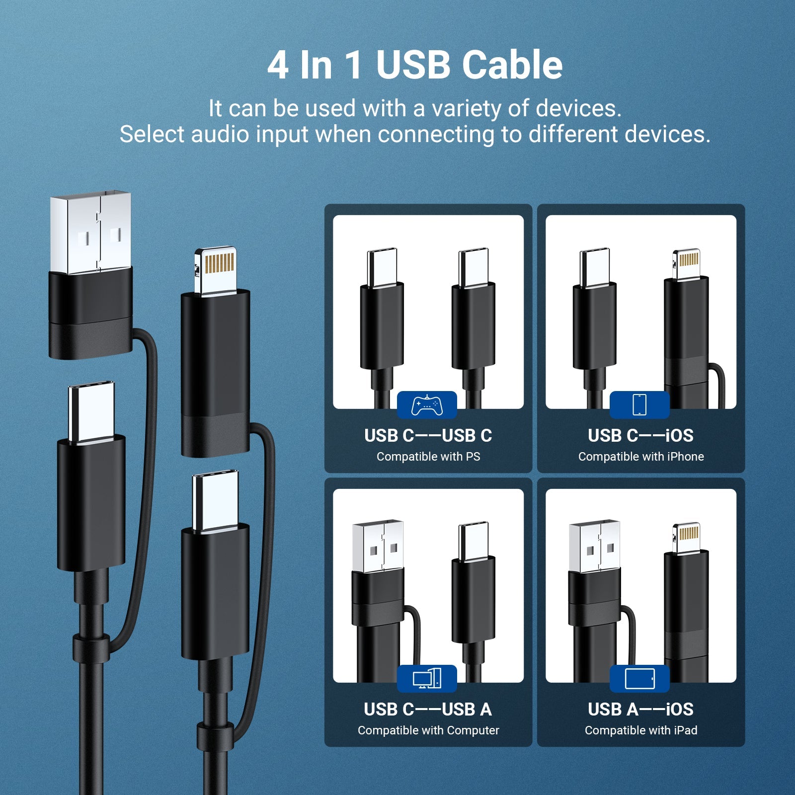 - Microfono Plug & Play : collegalo a un computer/laptop tramite il cavo USB 4 in 1 incluso (connettori USB C, USB A e iOS) e inizia a parlare, senza bisogno di driver. Compatibile con macOS, Windows, PC, iPhone e Android per videoconferenze, lezioni online, chiamate Zoom, chat di gioco, podcast di tavole rotonde e altro ancora. Nota: imposta il microfono esterno UM04 come dispositivo di input predefinito quando più dispositivi audio sono collegati al PC. Alcuni telefoni potrebbero richiedere l'attivazione della funzione OTG.