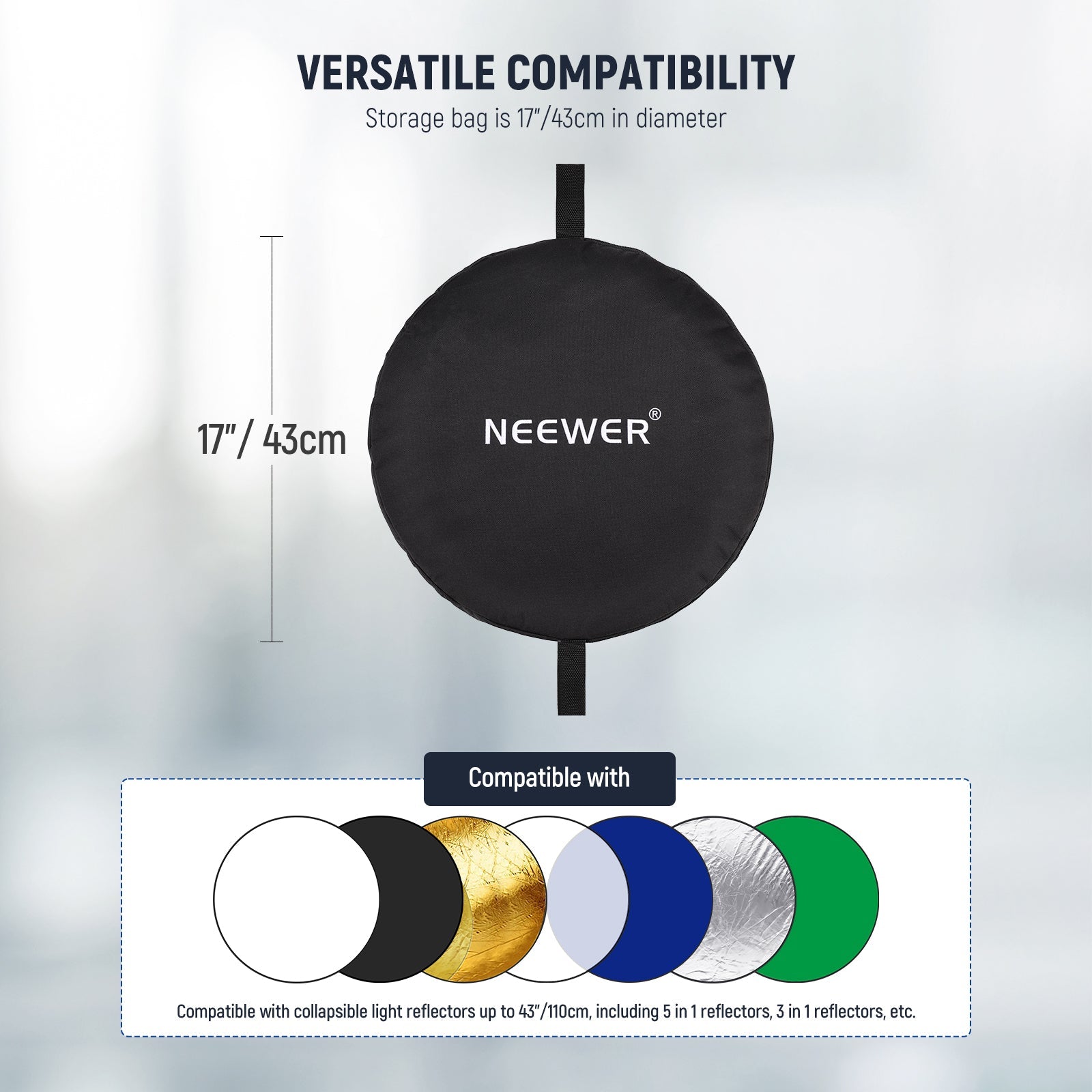 - Compatibilità versatile : la custodia NEEWER NB-06, che misura 17"/43 cm di diametro, è ampiamente compatibile con riflettori di luce pieghevoli fino a 43"/110 cm, inclusi riflettori 5 in 1, riflettori 3 in 1, ecc. La borsa facilita l'organizzazione conveniente del riflettore, assicurando che rimanga compatto per una facile conservazione e un trasporto senza problemi