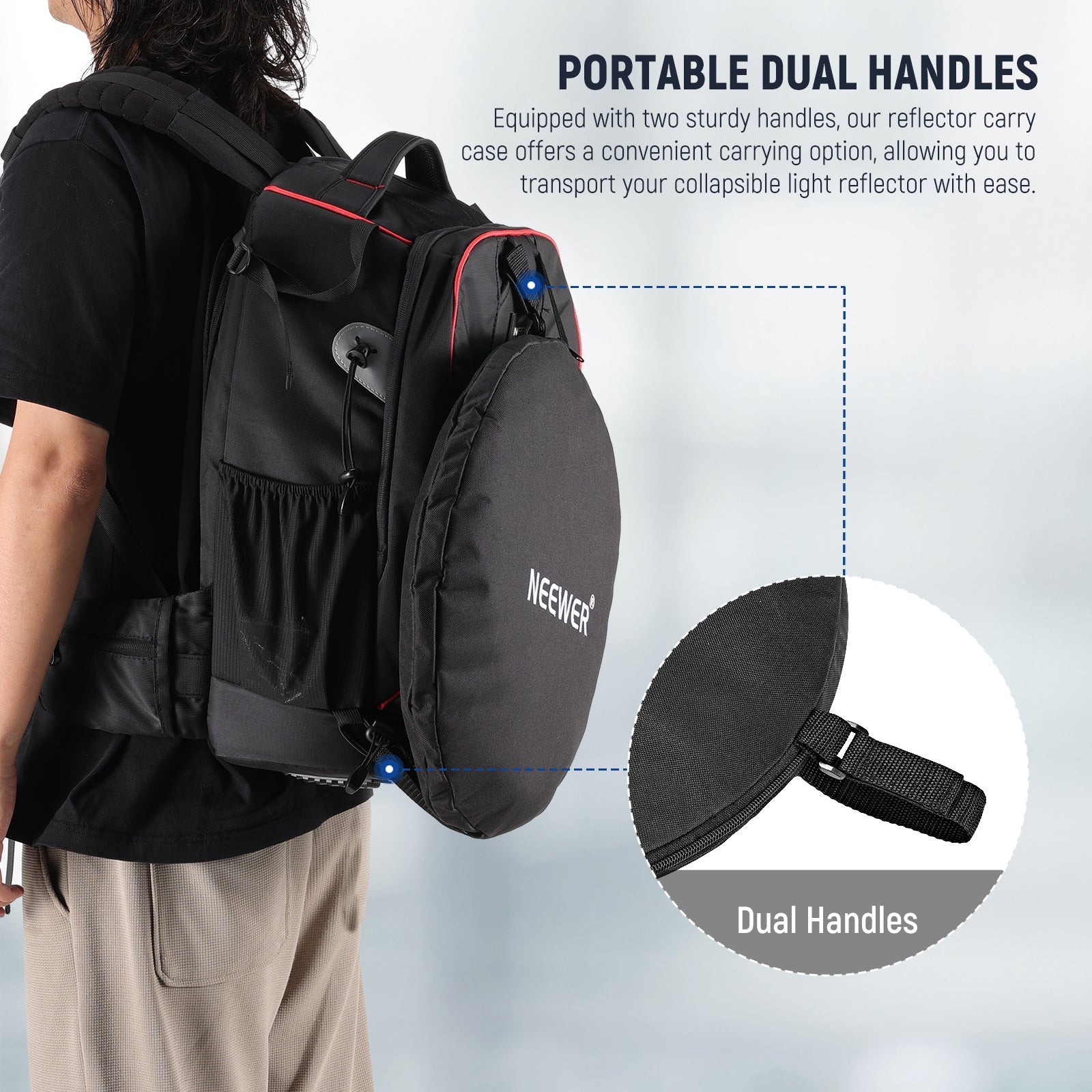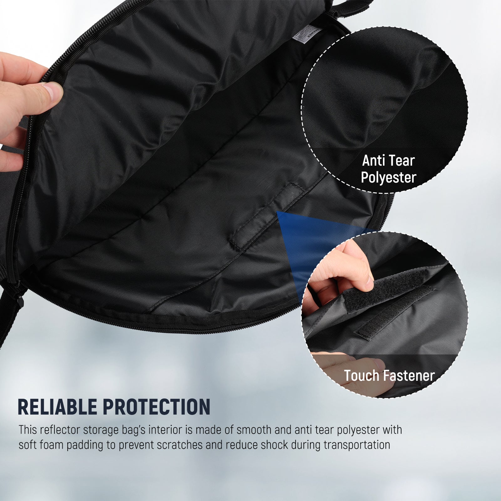 - Doppie maniglie portatili - Dotata di due robuste maniglie, la nostra custodia per il trasporto del riflettore offre una comoda opzione di trasporto, consentendoti di trasportare facilmente il tuo riflettore di luce pieghevole. Le maniglie hanno un design con chiusura adesiva, che facilita l'aggancio e il rilascio se necessario