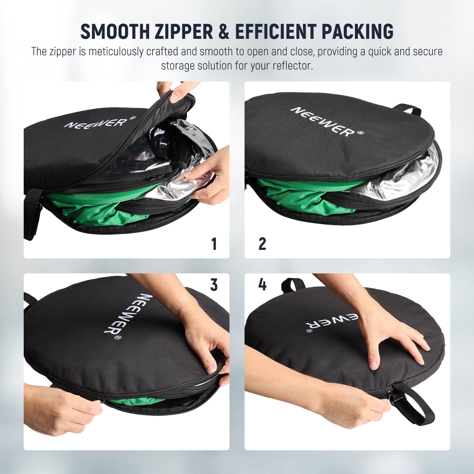 - Cerniera liscia e imballaggio efficiente : la cerniera è realizzata meticolosamente e liscia da aprire e chiudere, fornendo una soluzione di archiviazione rapida e sicura per il tuo riflettore. Con questa borsa puoi riporre rapidamente il tuo dispositivo dopo l'uso, risparmiando tempo e fatica durante le sessioni fotografiche