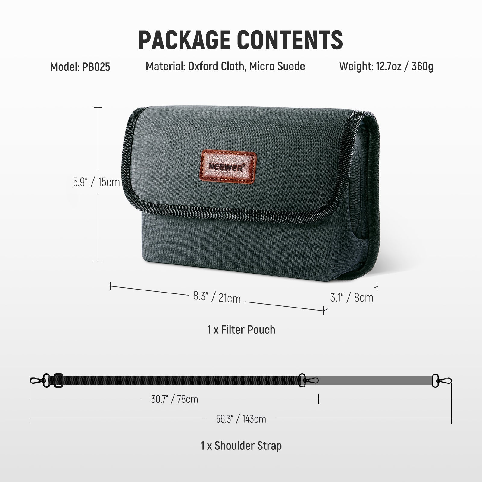 - Borsa professionale per il trasporto e la conservazione dei filtri : la custodia rigida per filtri per obiettivi della fotocamera NEEWER con tracolla si distingue per proteggere i tuoi preziosi filtri per obiettivi. Realizzata in materiale robusto e resistente all'acqua, questa borsa è durevole per riporre e trasportare, ideale per filtri quadrati da 4'' x 4'' o 4'' x 5,65'' quadrati o circolari da 95 mm