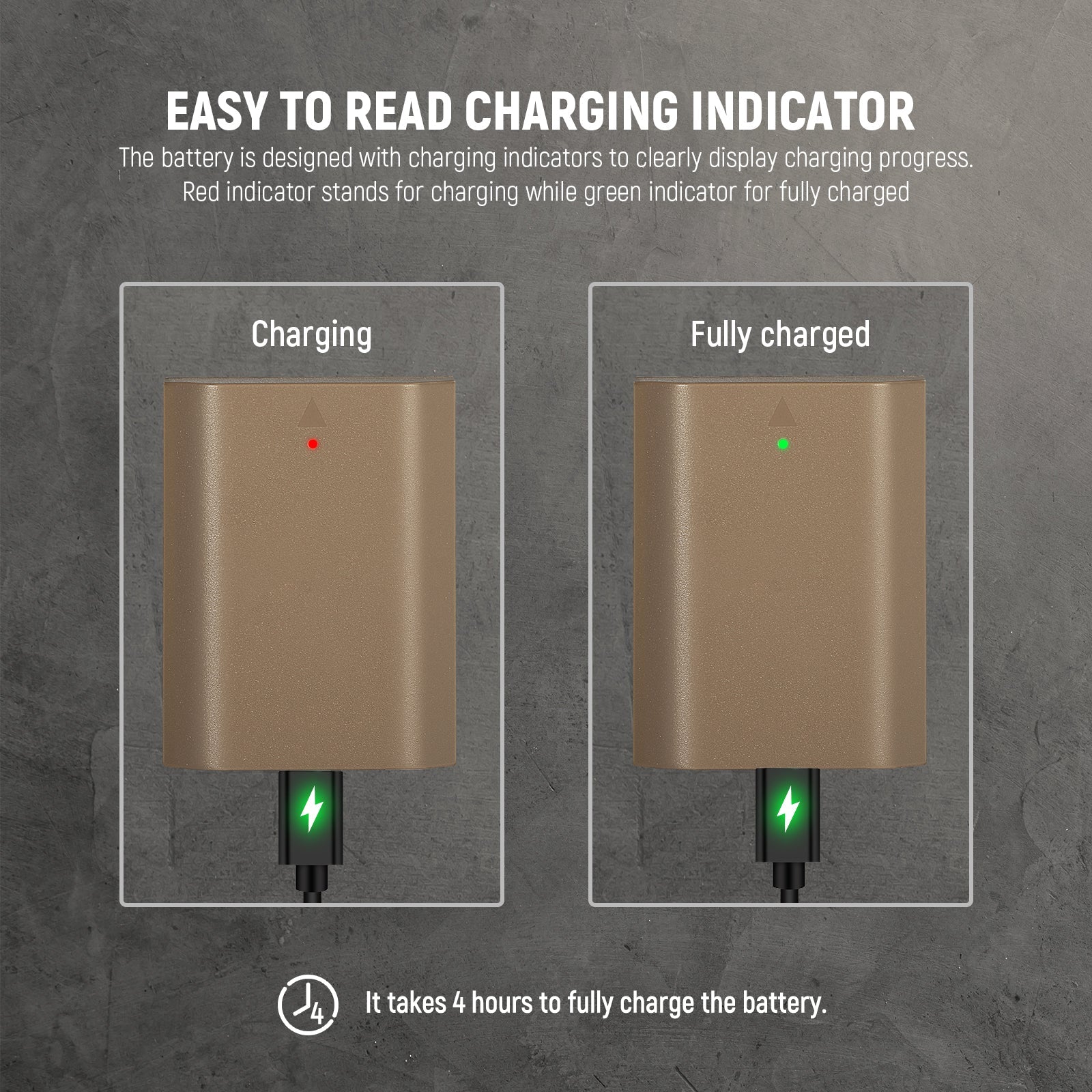 - Indicatore di carica facile da leggere - La batteria è progettata con indicatori di carica per mostrare chiaramente l'avanzamento della carica. L'indicatore rosso indica la carica mentre l'indicatore verde indica la carica completa