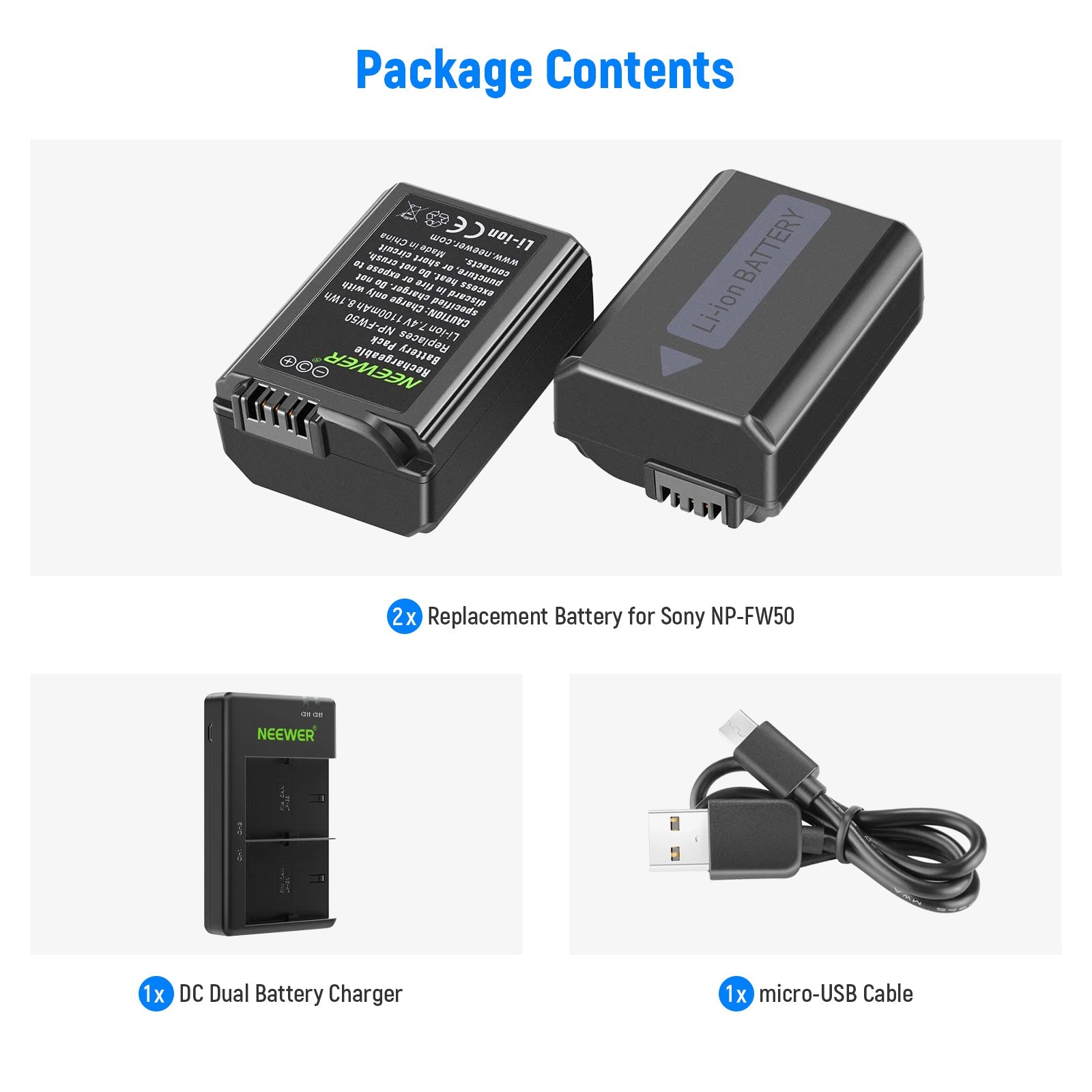 - Le batterie di ricambio Neewer sono realizzate secondo le specifiche esatte della batteria Sony NP-FW50 con una capacità leggermente maggiore di 1100mAh. Come la tua batteria originale, anche quelle Neewer possono essere caricate all'interno della tua fotocamera o con il caricabatterie originale. Il caricabatterie e la batteria sono completamente intercambiabili.