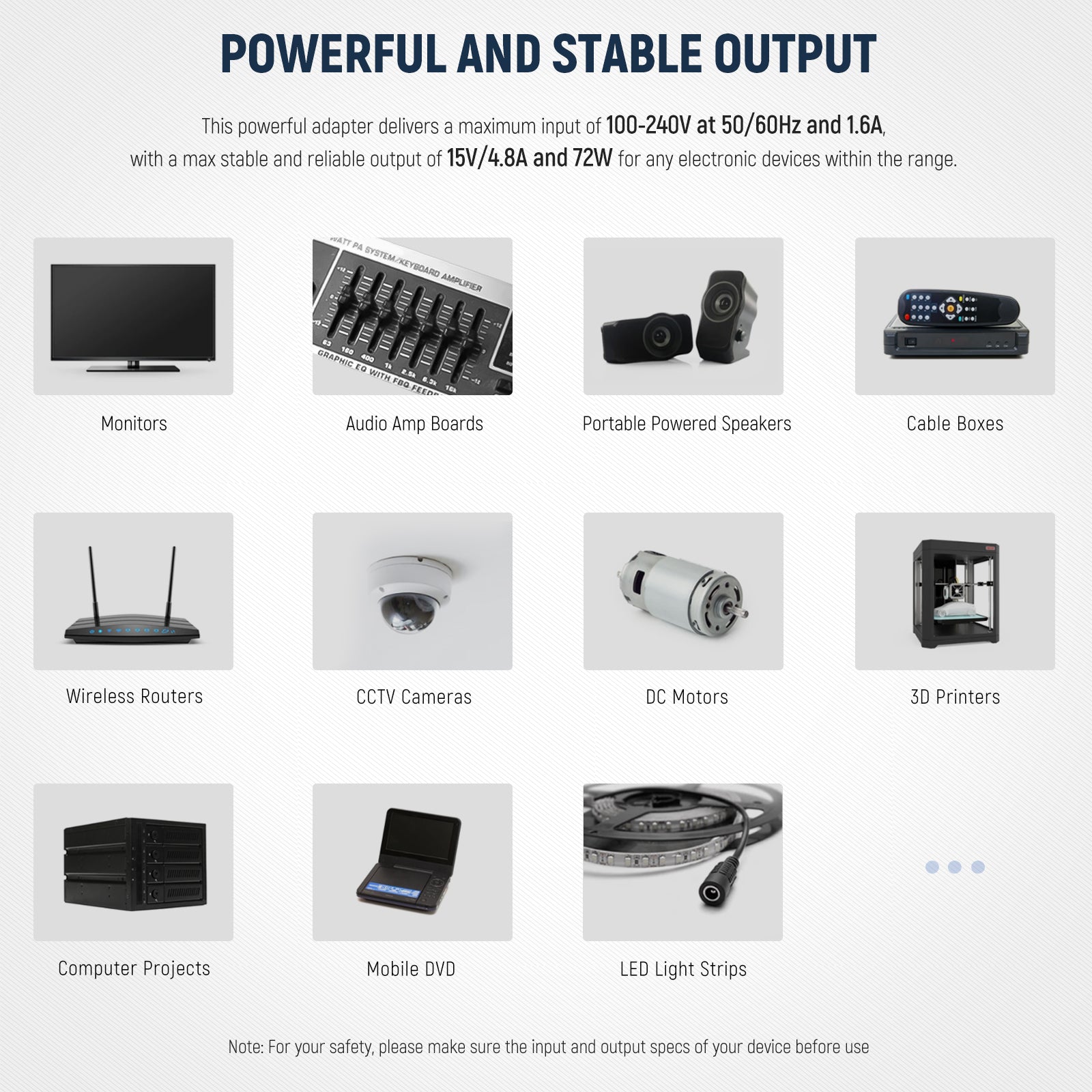 - Uscita 15 V/4,8 A 72 W : questo potente adattatore e cavo forniscono un ingresso massimo di 100-240 V a 50/60 Hz e 1,6 A, con un'uscita massima stabile e affidabile di 15 V/4,8 A e 72 W per qualsiasi dispositivo elettronico all'interno della gamma. Nota: per la tua sicurezza, assicurati delle specifiche di input e output del tuo dispositivo prima dell'uso