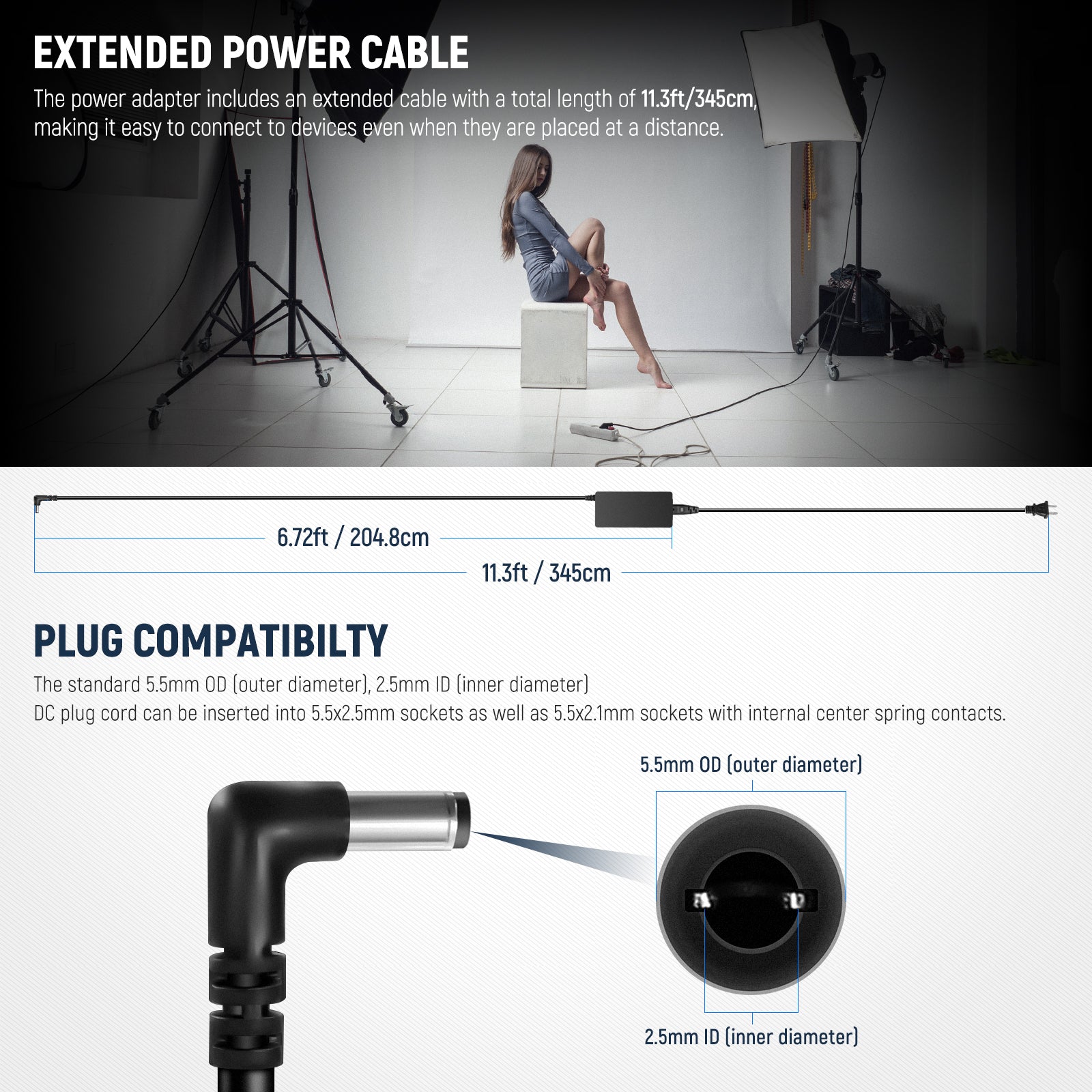 - Compatibilità estesa con cavi e prese : l'alimentatore e il cavo sono dotati di una lunghezza totale del cavo di 345 cm/11,3 piedi, facilitando la connessione ai dispositivi anche quando sono posizionati a distanza. Inoltre, il cavo della spina CC standard con diametro esterno da 5,5 mm (diametro esterno) e diametro interno da 2,5 mm (diametro interno) può essere inserito in prese da 5,5x2,5 mm e prese da 5,5x2,1 mm con contatti a molla centrali interni