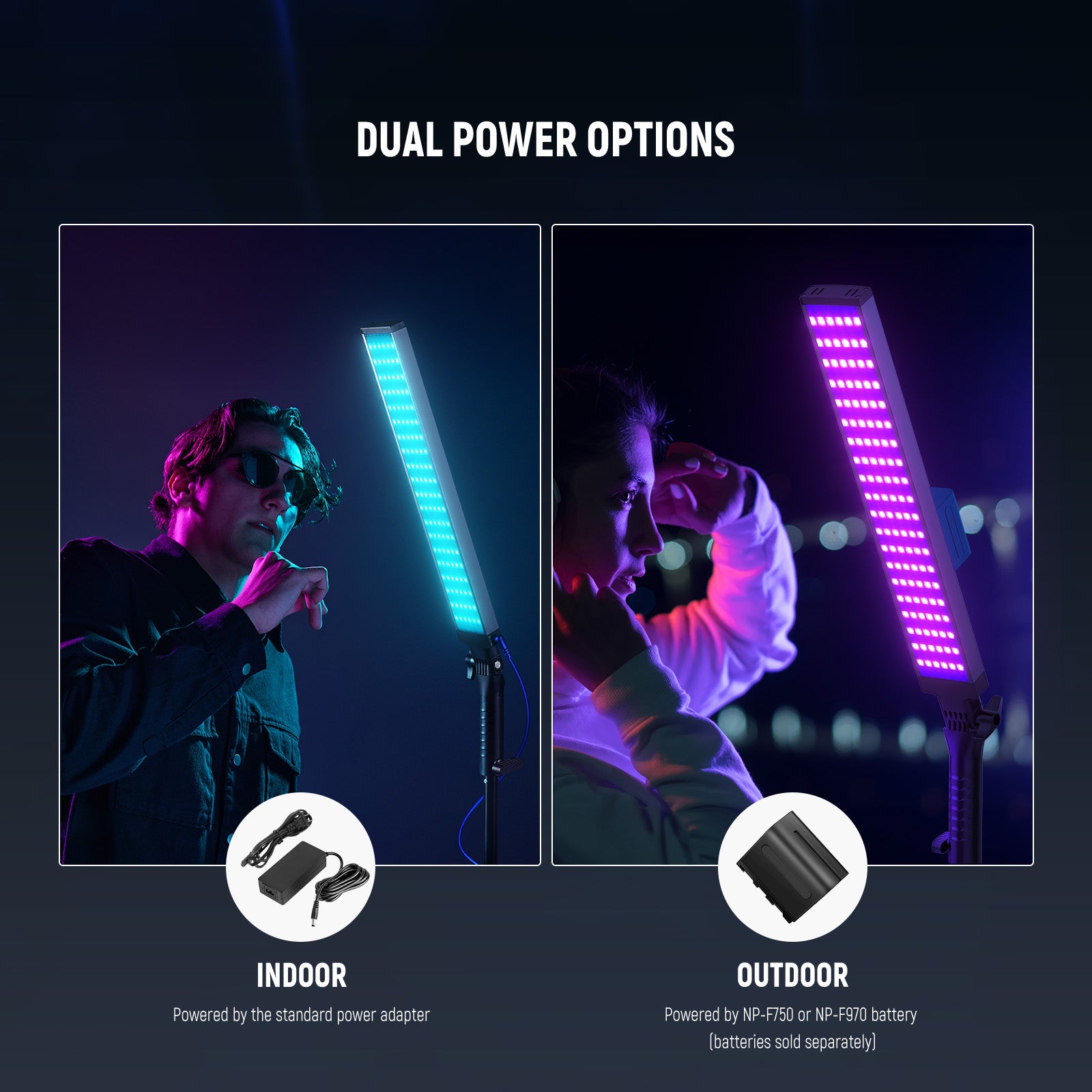 - Doppia alimentazione tramite adattatore/batteria NP-F - Gli adattatori e i cavi inclusi offrono una soluzione affidabile per riprese in interni prolungate, collegandosi direttamente alla presa di corrente. Per le riprese in esterni, è possibile alimentare queste luci tubolari a LED con batterie NP-F750 o NP-F970 (vendute separatamente), offrendo maggiore flessibilità ed eliminando il fastidio dei cavi.