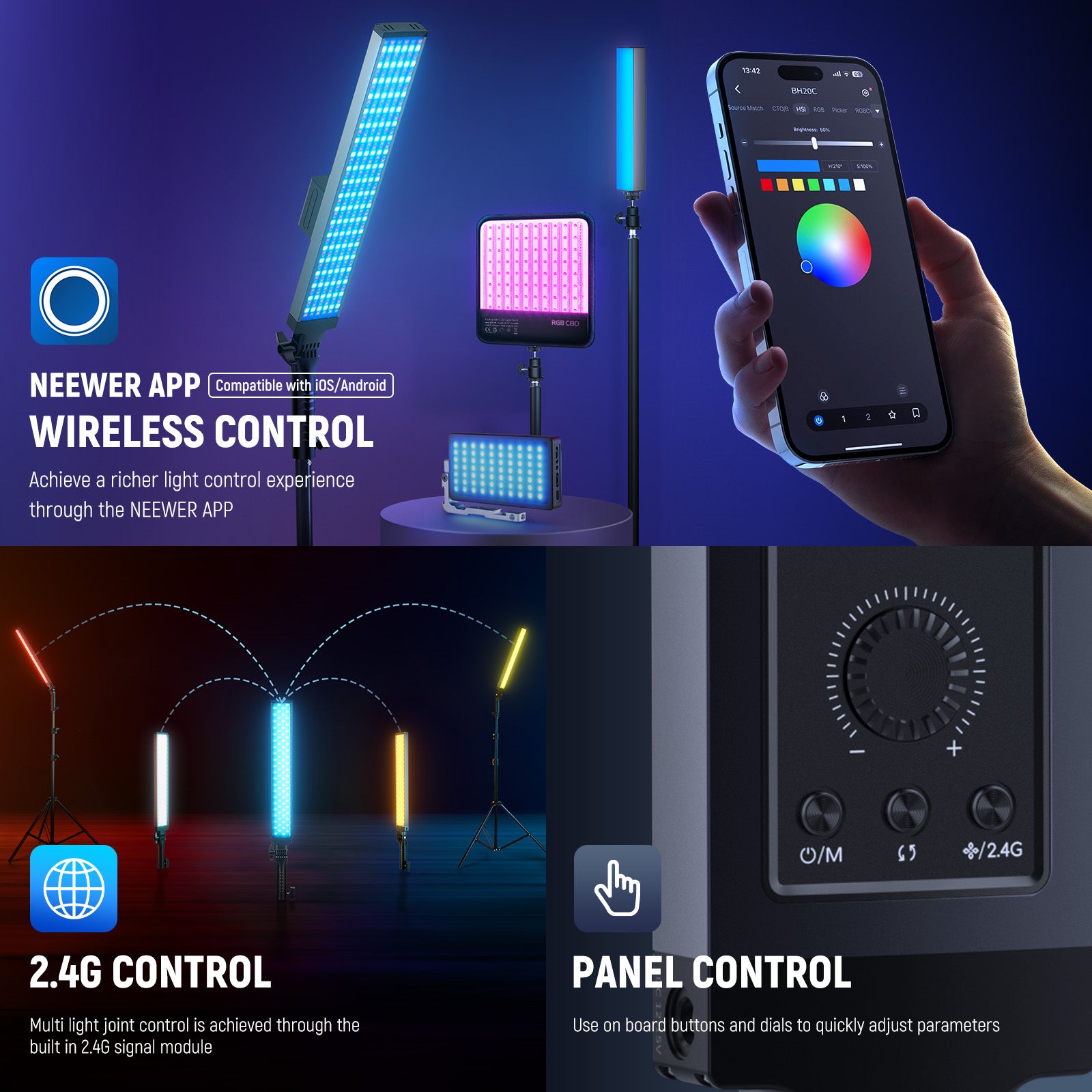- Controllo APP/2.4G/Pannello - Regola direttamente la temperatura del colore, la luminosità, il valore GM, ecc. tramite il pannello di controllo; oppure scarica l'APP NEEWER e collegala alle bacchette luminose tramite Bluetooth per gestire più funzioni; per esplorare di più, passa alla modalità 2.4G per il controllo multi-luce tramite il modulo di segnale 2.4G integrato. In questa modalità, più luci sono impostate sullo stesso canale, come CH88; quando ne regoli una, le altre cambieranno in sincronia, il che migliorerà l'efficienza di ripresa.