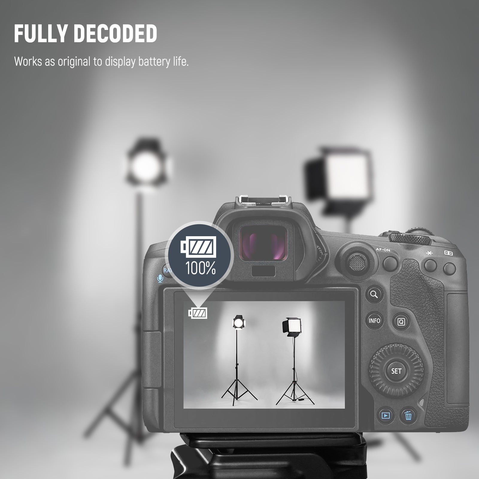- Batteria sostitutiva LP-E6P completamente decodificata - NEEWER TLP-E6P è una batteria di nuova generazione, completamente decodificata come alternativa professionale ai modelli originali LP-E6P/LP-E6NH/LP-E6N/LP-E6. È dotata di un'impressionante corrente di scarica continua massima di 6 A, che alimenta senza sforzo l'ultima serie EOS R, perfettamente compatibile con le fotocamere Canon EOS R5 Mark II EOS R5 EOS R6 EOS R7 EOS R EOS 5D Mark II/III/IV EOS 6D EOS 6D Mark II EOS 7D EOS 7D Mark II EOS 60D EOS 70D EOS 80D EOS 90D
