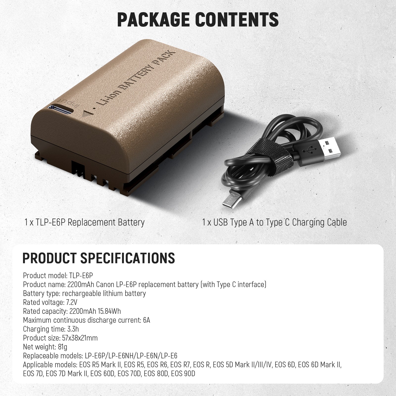 - Realizzato secondo gli standard originali - Il TLP-E6P è completamente decodificato per adattarsi alle specifiche della batteria LP-E6P originale, condividendo le stesse dimensioni, ricaricato utilizzando il caricabatterie LP-E6P originale e consentendo la visualizzazione in tempo reale del livello della batteria sulla fotocamera. Si adatta perfettamente al vano, evitando problemi come inceppamenti o rigonfiamenti che potrebbero potenzialmente danneggiare la fotocamera (caricabatterie o fotocamera NON inclusi)