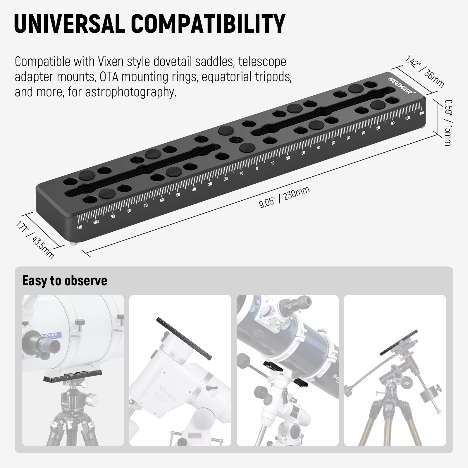 - Contrassegni di scala precisi : i contrassegni di scala su entrambi i lati ti aiutano a trovare una posizione precisa per montare la tua attrezzatura per l'astrofotografia, l'osservazione celeste, l'osservazione del cielo notturno e l'osservazione delle stelle